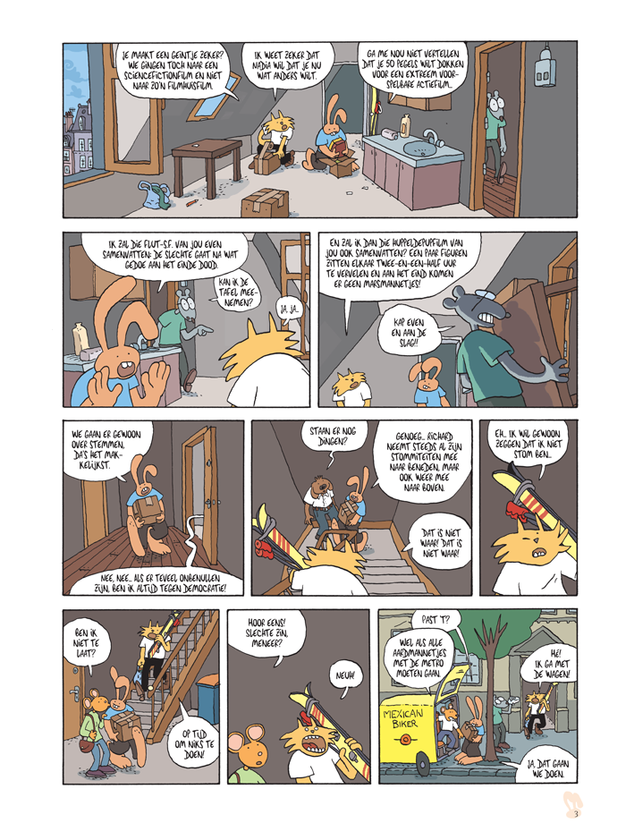 In de hel is elke dag hetzelfde en het leven is een sleur. Pas maar op voordat je je aan iemand bindt, zo houdt Richard voor aan Kobijn. Gelukkig is zijn relatie met Nadia nog lang niet saai. En al helemaal niet omdat ze een geheimzinnig genootschap ontdekken dat alle hondendrollen in de stad omcirkelen met hun spuitbussen. Wie zijn die figuren en willen ze een interview geven over hun actie? Richard leeft intussen in de veronderstelling dat de buurman van Kobijn een buitenaards wezen is. Hij blijkt moeilijk van dat idee af te brengen. Hij denkt zelfs dat zijn laatste uur heeft geslagen als de buurman hem betrapt in zijn appartement. Genoeg verwikkelingen om over na te praten.