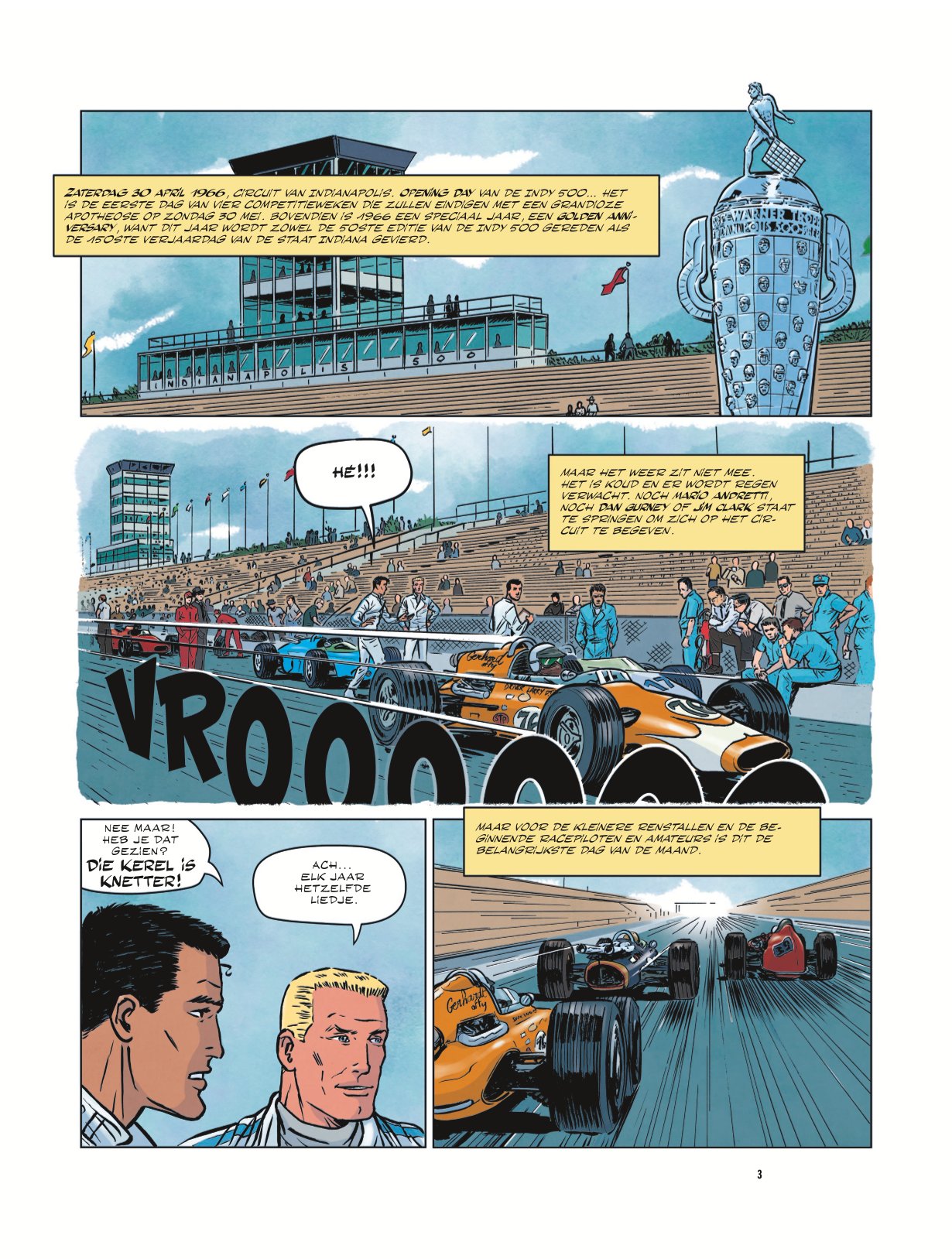 Spin off van de reguliere reeks Herontdek de mythische Indianapolis 500 Miles race van 1966 in dit onuitgegeven verhaal van Michel Vaillant! De Indianapolis 500, editie 1966, was een mythische race in vele opzichten. In de eerste plaats omdat het een ware slachting was onder de deelnemende auto's bij de start, maar vooral omdat het een verpletterend spannende finale opleverde tussen Graham Hill en Jim Clark, twee kampioenen die vochten om de race tot de - betwiste - overwinning van de eerste. Waarom hebben de officials zich gemoeid met het aantal rondes die aan Clark werden toegekend? En wat gebeurde er achter de schermen van deze legendarische gebeurtenis? Michel Vaillant was erbij en onthult nu al zijn geheimen... In deze Legendes-reeks (her)ontdek je de grootste races uit de geschiedens door nieuwe inzichten en verhalen! Daarin zien we Michel Vaillant terug in het jaar 1966 en neemt hij deel aan de 500 mijl van Indianapolis met de Vaillante Speciale Indianapolis uit de periode van het album Paniek in Indianapolis (1966). Dat jaar zorgde een enorm ongeval bij de start ervoor dat elf van de drieëndertig auto's meteen waren uitgeschakeld bij de werkelijke 500 mijl van Indianapolis. De Brit Graham Hill won de race, maar zijn landgenoot Jim Clark had het hoogste trapje van het podium moeten beklimmen. In Michel Vaillant Legendes zullen Michel, Jean-Pierre en Steve Warson, net zoals hun lezers, die race meebeleven, vanaf de testritten op 30 april tot 30 mei, de dag van de Indy 500. De strip moet een antwoord bieden op de vraag 'Wat is er in 1966 in Indianapolis gebeurd?' Volgende delen van deze nieuwe reeks zullen zich tegen historische gebeurtenissen in de jaren 1960 en 1970 afspelen. (ssz)