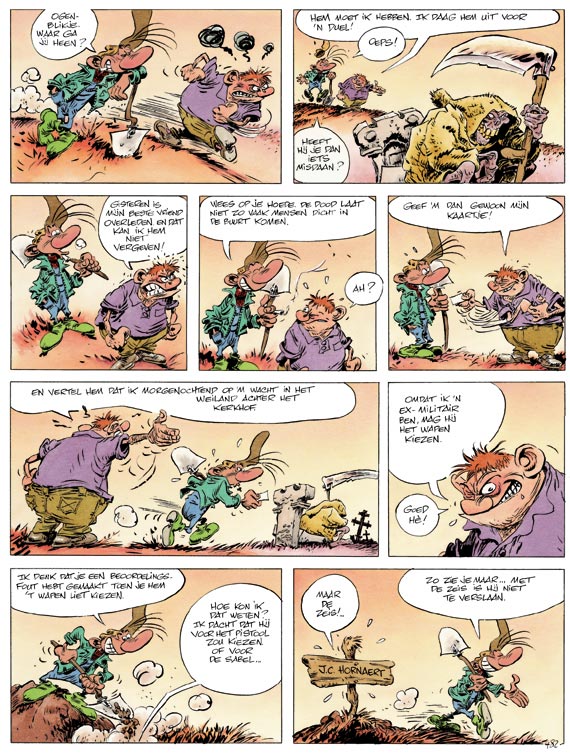 De laatste 4 exemplaren! Je zou denken dat een doodgraver een rustig leventje leidt en geen stress kent, maar dan vergis je je lelijk. Niet alle doden vinden snel eeuwige rust, anderen gedragen zich ook dood alsof ze nog steeds leven en de grappigste doden maken er een spelletje van om de Dood uit te dagen en zo uit te zoeken of die wel zin voor humor heeft. Daar staat G. Raf Zerk tussen die moet proberen rust en kalmte te laten heersen. Geen makkelijke opdracht ... Cauvin en Hardy lachen (en laten lachen) met de dood, een onderwerp dat als een van de laatste taboes wordt beschouwd.