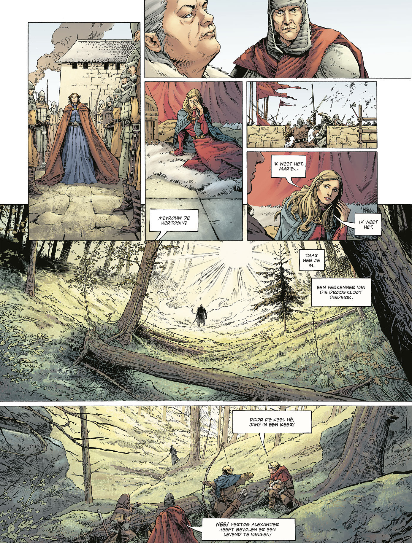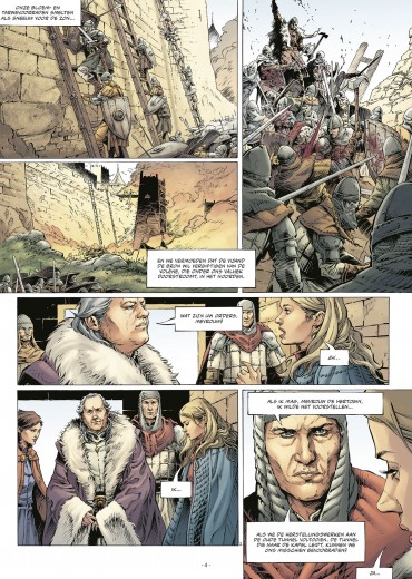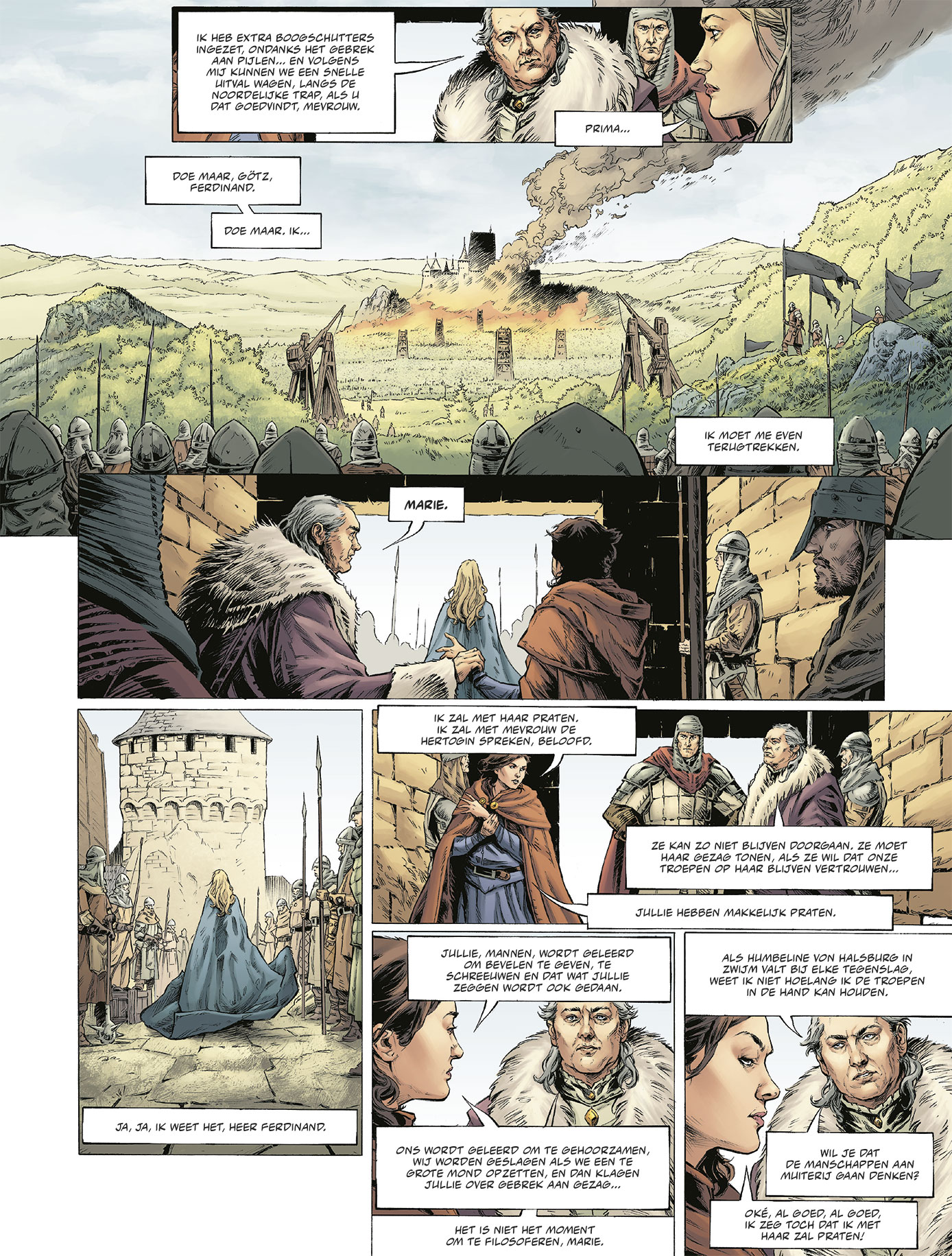 Tristan von Halsburg zit in het hoge noorden, waar hij met de rechtmatige troonsopvolger, Abel Plovpenning, de troon van Denemarken probeert te veroveren. Maar ook Margrete Plovpenning aast op die troon, en op Tristans hart. In Halsburg staat Diederik de Ontaarde voor de poorten van het kasteel van Humbeline. De hertogin wankelt, weifelt, is ze wel sterk genoeg om het hertogdom te redden? In In vrouwenhanden staan de vrouwen centraal, zowel in Denemarken als in Halsburg houden zij de touwtjes strak in handen