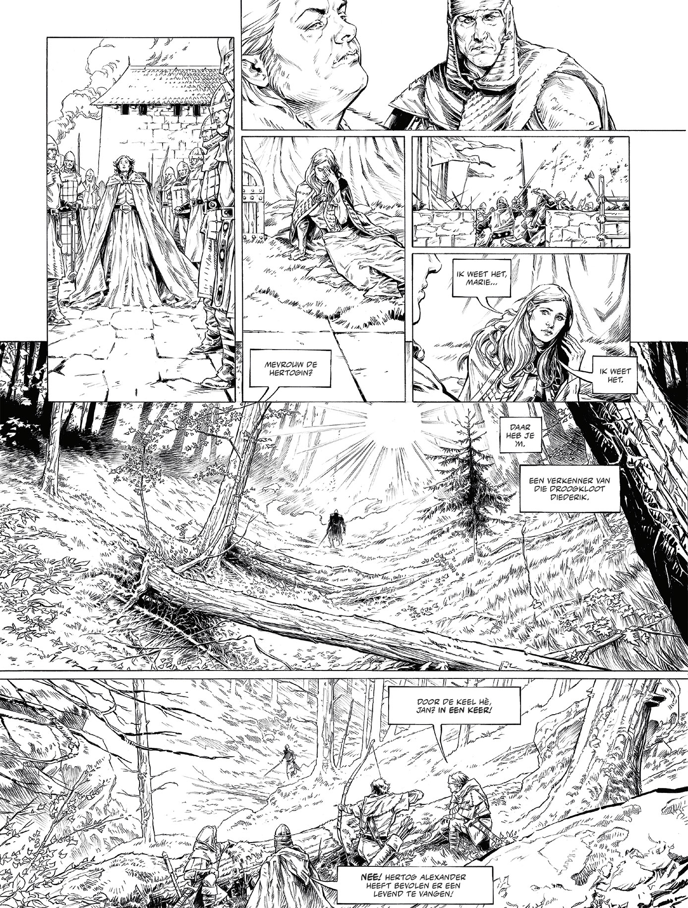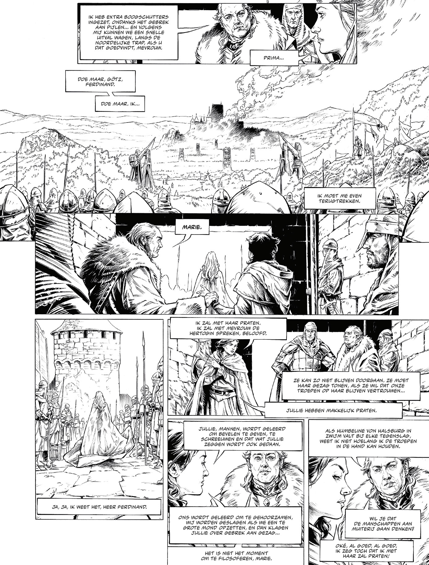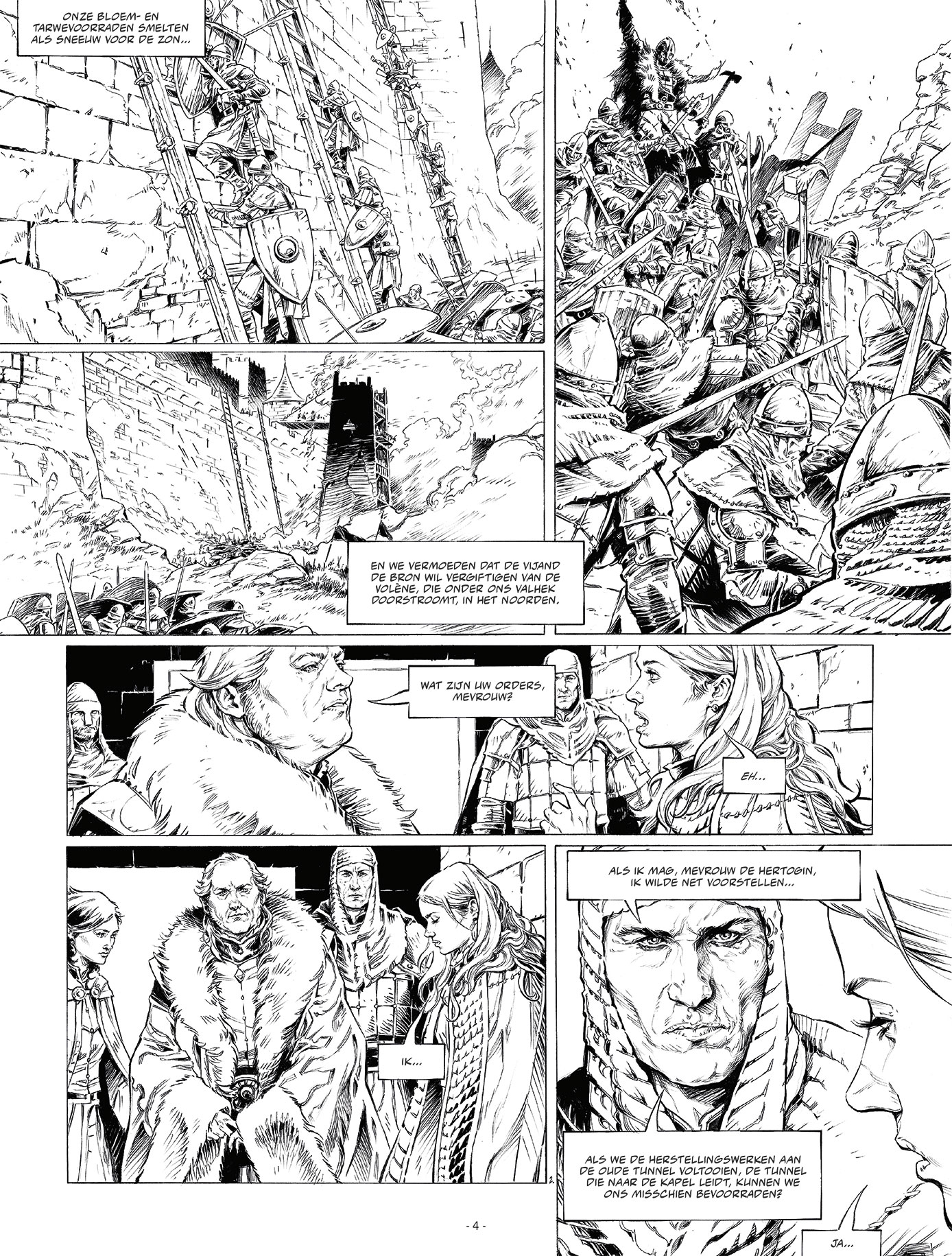 Tristan von Halsburg zit in het hoge noorden, waar hij met de rechtmatige troonsopvolger, Abel Plovpenning, de troon van Denemarken probeert te veroveren. Maar ook Margrete Plovpenning aast op die troon, en op Tristans hart. In Halsburg staat Diederik de Ontaarde voor de poorten van het kasteel van Humbeline. De hertogin wankelt, weifelt, is ze wel sterk genoeg om het hertogdom te redden? In In vrouwenhanden staan de vrouwen centraal, zowel in Denemarken als in Halsburg houden zij de touwtjes strak in handen