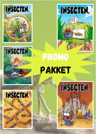 Promopakket met de eerste 5 delen van deze super leerrijke reeks over insecten. Hoe houd je de verschillende insectenfamilies uit elkaar? Wist je dat sommige rupsen doen alsof ze een slang zijn om hun hachje te redden? En dat er vogels zijn die zich voordoen als rupsen? En de pandamier, ken je die? Of de gemaskerde roofwants? Ze zijn stuk voor stuk van de partij in dit nieuwe album waarin je een hoop leert over al die zes-potige diertjes. Lachen en leren met deze kleurrijke stripreeks. 1-paginagags met handige steekkaarten over insecten. Wetenschappelijke informatie, overgoten met een prettig gestoord sausje.