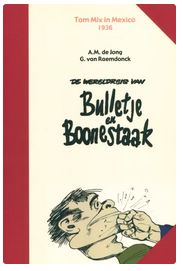 De levertermijn van de boeken van Uitgeverij Boumaar (indien we ze niet op stock hebben) is iets langer dan gewoonlijk. Gelieve hiermee rekening te houden. Alvast bedankt voor uw geduld. Bulletje en Boonestaak begonnen hun carriëre in 1922 en die duurde tot 1937. 44 Avonturen werden in de socialistische krant voorgepubliceerd en 19 verhalen kwamen in vijf verschillende periodes uit in boekvorm: in oblonbundelingen in de twintiger jaren, op pocketformaat in de jaren dertig (kleine gebonden harde kaften – pocket werd pas na de oorlog als benaming ingevoerd), weer oblong in de jaren vijftig en daarna op comic-formaat met een geheel nieuwe lay-out in de jaren zestig en zeventig. Met deze Boumaar-reeks is begonnen, daar waar andere uitgevers ophielden: bij verhaal 20 en afgemaakt tot de laatste strook. De complete uitgavenreeks is na 14 jaar werken nu beschikbaar. De Jong en Van Raemsdonck waren vrienden zoals Bulletje en Boonestaak waren in hun avonturen. Waarschijnlijk kun je De Jong vergelijken met Bulletje: een lawaaipapagaai die barstte van de energie en ideeën, streken uithaalde en verhalen kon vertellen als geen ander. ‘t Leverde de beste en meest humoristische verhalen op tot Franquin die met Guus Flater evenaarde. In alle 44 delen worden stukjes uit die periode, anecdotes van beide heren en tijd waarin zij leefden, besproken. Nu, na 95 jaar nog altijd een ‘must’ om te lezen. Opmerking c.q. waarschuwing: de strip bevat blote billen, grof taalgebruik en duidelijke stellingnames tegen ieder geweld, dat door De Jong en Van Raemdonck duidelijk en afschrikwekkend in beeld is gebracht. zwart/wit