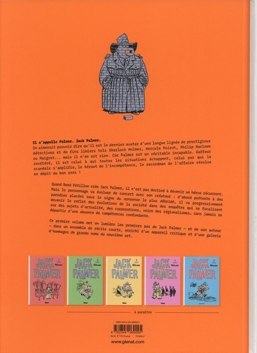 Toute la carrière du moins fameux des détectives privés enfin réunie dans une édition intégrale de référence Il s'appelle Palmer. Jack Palmer. On aimerait pouvoir dire qu'il est le dernier avatar d'une lignée de prestigieux détectives et de fins limiers tels Sherlock Holmes, Hercule Poirot, Philip Marlowe ou Maigret... mais il n'en est rien. C'est au contraire un modèle d'anti-héros, qui depuis 50 ans résout par inadvertance et à ses corps et intelligence défendants meurtres et mystères. Gaffeur invétéré, il est celui à qui toutes les situations échappent, celui par qui le scandale s'amplifie... Quand René Pétillon crée Jack Palmer, il n'est pas destiné à devenir un héros récurrent. Mais le personnage va évoluer de concert avec son créateur : d'abord prétexte à des parodies placées sous le signe du nonsense le plus débridé, il va devenir progressivement reflet des évolutions de la société dans des enquêtes qui se focalisent qui sur des sujets d'actualité, qui sur des corporations, voire des régionalismes... sans jamais se départir d'une absence de compétence confondante. Cette intégrale en 5 volumes conçue de concert avec les éditions Dargaud (qui détiennent à leur catalogue les derniers titres de la série), permet de redécouvrir chronologiquement toutes les histoires que Pétillon a consacré à Palmer. Dans ce premier volume, le lecteur trouvera les balbutiements d'un auteur et d'un personnage, à la fin des années 70 et au début des années 80, dans un ensemble de récits courts mis en scène avec un dessin noir et blanc très dense et minutieusement détaillé aux antipodes du trait de la maturité de Pétillon. Le volume est enrichi d'un appareil critique qui analyse et explicite l'évolution du dessin et le contexte de création des histoires, le tout accompagné d'hommages inédits au personnage de Palmer par d'illustres noms du Neuvième Art.