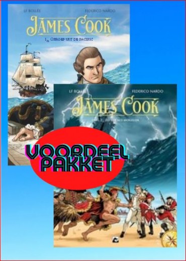 voordeelpakket met dit complete verhaal is een verderzetting van de reeks Collectie Explora die uitgegeven werd bij Glenat James Cook is ongetwijfeld een van de grootste zeevaarders in de geschiedenis van maritieme verkenning. Deze Engelse kapitein van de Royal Navy heeft het grootste deel van zijn carrière gewijd aan zeilen over de hele wereld, en in het bijzonder in de Stille Oceaan. Hij begon zijn carrière bij de Britse Royal Navy in 1755, voordat hij een uitstekende cartograaf werd tijdens een tocht in het huidige Canada. Zijn eerste reis rond de wereld, aan boord van de Endeavour, is van aanzienlijk belang voor de geschiedenis van de maritieme geografie. Daarna volgden nog twee andere reizen, waarbij hij nog veel meer ontdekkingen deed en die onze visie op de wereld hebben veranderd. Na de eerste reis rond de wereld aan boord van de Endeavour door James Cook, heeft hij zijn status in de oceanische geografie gevestigd. Twee andere reizen volgen, waarbij hij onder meer de complete rondreis door Nieuw-Zeeland maakte, Nieuw-Caledonië verkende, het Antarctische continent naderde, Paaseiland bestudeerde en het bewijs leverde dat het grote veronderstelde continent Austral niet bestaat. Uiteindelijk ontdekt James Cook Hawaï (Sandwich Islands in die tijd) waar hij in 1779 in bijzonder tragische omstandigheden wordt gedood. LF Bollée schrijft verder over het zuidelijk halfrond om een hartstochtelijk eerbetoon te brengen aan een van de grootste ontdekkingsreizigers aller tijden, briljant getekend door Federico Nardo, die zijn smaak voor avontuur en het buitenleven opnieuw volledig kan tonen.