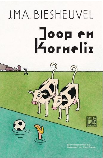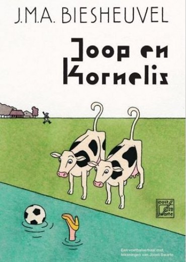 ‘Er stonden twee koeien in de wei. De eerste, die vreemd genoeg Joop heette, was verschrikkelijk wild en verzon iedere dag nieuwe spelletjes.’ Zo begint ‘Joop en Kornelis’, een van de wonderlijkste korte verhalen van J.M.A Biesheuvel, dat in zijn geheel over voetbal gaat, maar vanuit een perspectief dat alleen in het Biesheuveliaans universum kan zijn bedacht. Joost Swarte gaf het verhaal aan de vooravond van het EK Voetbal vorm in een schitterende leporello van twaalf bladzijden. Het geheel is uitgevoerd in zware kleurendruk met prachtige illustraties in Swartes zo kenmerkende heldere stijl.