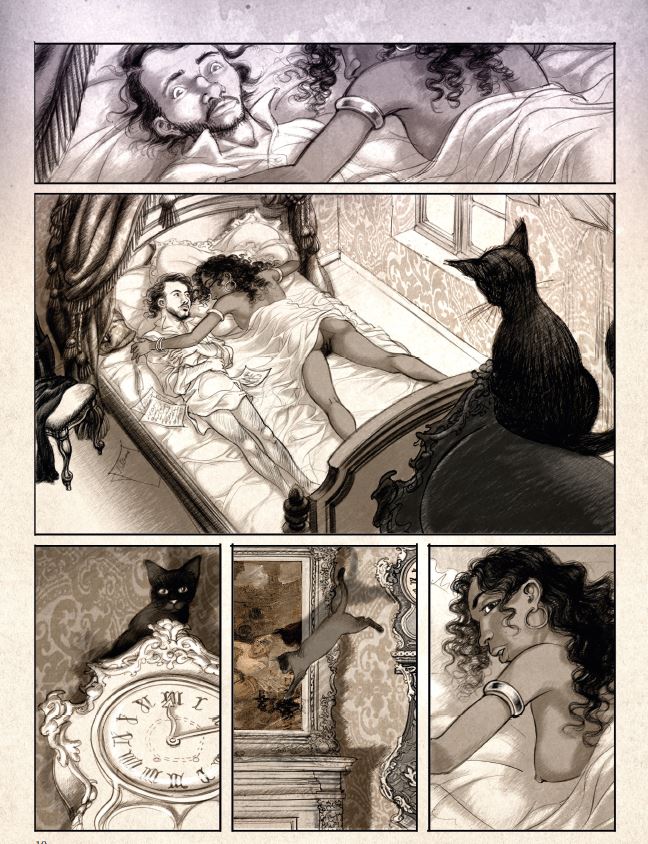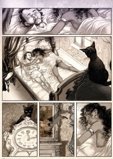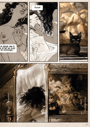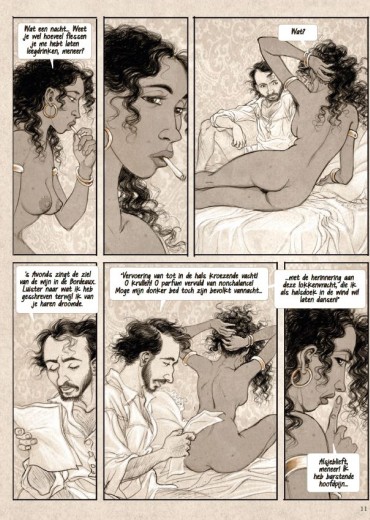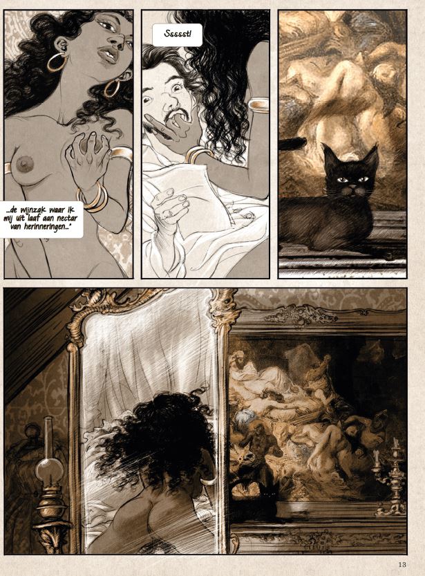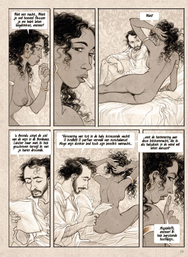Score moyen 4 / 5Jeanne Duval, of hoe ze ook mag heten, heeft geld nodig. Dringend. Ooit was ze de vrijgevochten muze van de dandyeske, rebelse kunstenaarsbende rond Nadar, Gérard de Nerval en Charles Baudelaire. Maar de tijd was de mysterieuze Creoolse actrice niet goed gezind. Vandaag is ze half verlamd en straatarm. Ze schrijft een lange brief naar de steenrijke moeder van Baudelaire, háár Baudelaire. Daarin zet ze de puntjes op de i over haar turbulente relatie met de verdoemde dichter. Ze blaast alle valse romantiek weg en ze staat op haar financiële rechten. Maar tegelijk schrijft ze dit zo ontluisterend mooi dat de warte Venus wel meer moest zijn dan een bekoorlijk exotisch lichaam. Juffrouw Baudelaire is een machtig verpakte biografie over de grootste dichter die Frankrijk ooit gekend heeft. Alles is echt gebeurd. Het zijn allemaal feiten. Naakte feiten. Nuchtere feiten. Deze strip is een droom voor de pure geschiedenisliefhebber. Toch ligt er een forse laag melancholie en romantiek over deze waarheid. Yslaire koos ervoor om het verhaal vanuit de ogen van de muze van Baudelaire te vertellen. Zo kan hij de narcistische dromer een spiegel voorhouden. Ja, Baudelaire was niet alleen de straffe dichter die het liefdesspel zelfs na tweehonderd jaar nog hemels kan doen klinken. Hij was ook een drugsverslaafde alcoholist die zijn erfenis in een razendsnel tempo erdoor joeg. Alles deed hij voor zijn zwarte Venus. Ze hadden op alle vlakken een gouden band die hem snel financieel armer, maar even snel mentaal rijker maakte. Hun relatie werd helaas steeds complexer. Het was een voortdurend gevecht van liefde en vervloeking. Omdat je het verhaal leest vanuit de nuchtere gedachten van de muze, bekijk je het hele gebeuren vanop enige afstand. Je ziet wanneer Jeanne acteert of wanneer ze echt is. Baudelaire zit verstrikt in haar web. Deze strip, die als één groot verlangen in een neerwaartse spiraal leest, is echt knap verteld. De tekenaar van Samber speelt niet alleen met obsessies en zelfbewustzijn, maar hij houdt ook de jonge kunstenaarsbende een actuele spiegel voor. Jeanne is een wat marginale, maar vrijgevochten feministe waar de zelf verklaarde moderne revolutionairen niet klaar voor zijn. Hierdoor wordt ze tegelijk aanbeden en verketterd als een verdoemde vrouw, la fleur du mal. Gelukkig zou ze vandaag anders bekeken worden... of toch nog steeds niet. Dat voortdurende conflict is ook zichtbaar in de tekeningen. De tekeningen stralen zowel melancholie, dood als seks uit. Geregeld pakt Yslaire uit met expliciete seksscènes die hij combineert met mythologie en religie. Overal zoekt wit zwart op. Hij laat de tekst botsen met de tekeningen, om ze op de volgende bladzijde direct weer te verzoenen. Juffrouw Baudelaire is meer dan een conflictstrip. Het is ook de ultieme symbiose van het hele ouvre van Hislaire, Yslaire, Sylaire of hoe hij zich ook laat noemen. Alles komt hier perfect gedoseerd samen. De brute tederheid van Frommeltje en Viola, de melancholie van Samber, de engelen en waterspuwers uit XXe ciel.com (ook als Eva's Gesternte uitgegegevb), het op de spits gedreven conflict van De Hemel boven Brussel en het zoeken naar perfectie uit De Hemel boven het Louvre. En dit alles in 's mans favoriete tijdperk, de Franse revolutie. Ook grafisch verbindt hij zijn Samber-stijl met zijn latere voorliefde voor digitaal werk. We hadden nooit gedacht dat de 64-jarige Brusselaar dit nog in zijn mars had. Juffrouw Baudelaire is een onweerstaanbaar epos over de totale liefde van een dromerige narcist met zijn libertijnse muze. Gitzwarte romantiek, krachtig in beeld gebracht door een Yslaire in absolute topvorm. Een dijk van een strip. ssz