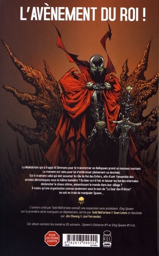 La Malédiction qui a frappé Al Simmons pour le transformer en Hellspawn prend un nouveau tournant. Le moment est venu pour lui d'embrasser pleinement sa destinée. Est-il vraiment celui qui doit assumer le rôle de Roi des Enfers, afin d'unir l'ensemble des armées démoniaques sous la même bannière ? Ou bien va-t-il fuir et laisser les hordes infernales déclencher le chaos ultime, anéantissant le monde dans leur sillage ? A moins qu'une organisation connue seulement sous le nom de "La Cour des Prêtres" ne soit en train de manipuler Spawn... L'univers créé par Todd McFarlane connaît une expansion sans précédent. King Spawn est la première série marquant ce déploiement, écrite par Todd McFarlane & Sean Lewis et dessinée par Jim Cheung & Javi Fernandez. Cet album contient les numéros US suivants : Spawn's Universe #1 et King Spawn #1 à 6.
