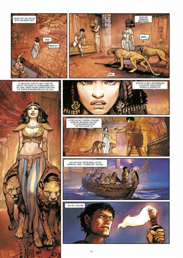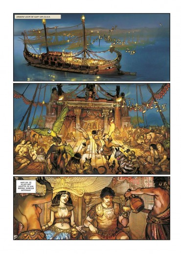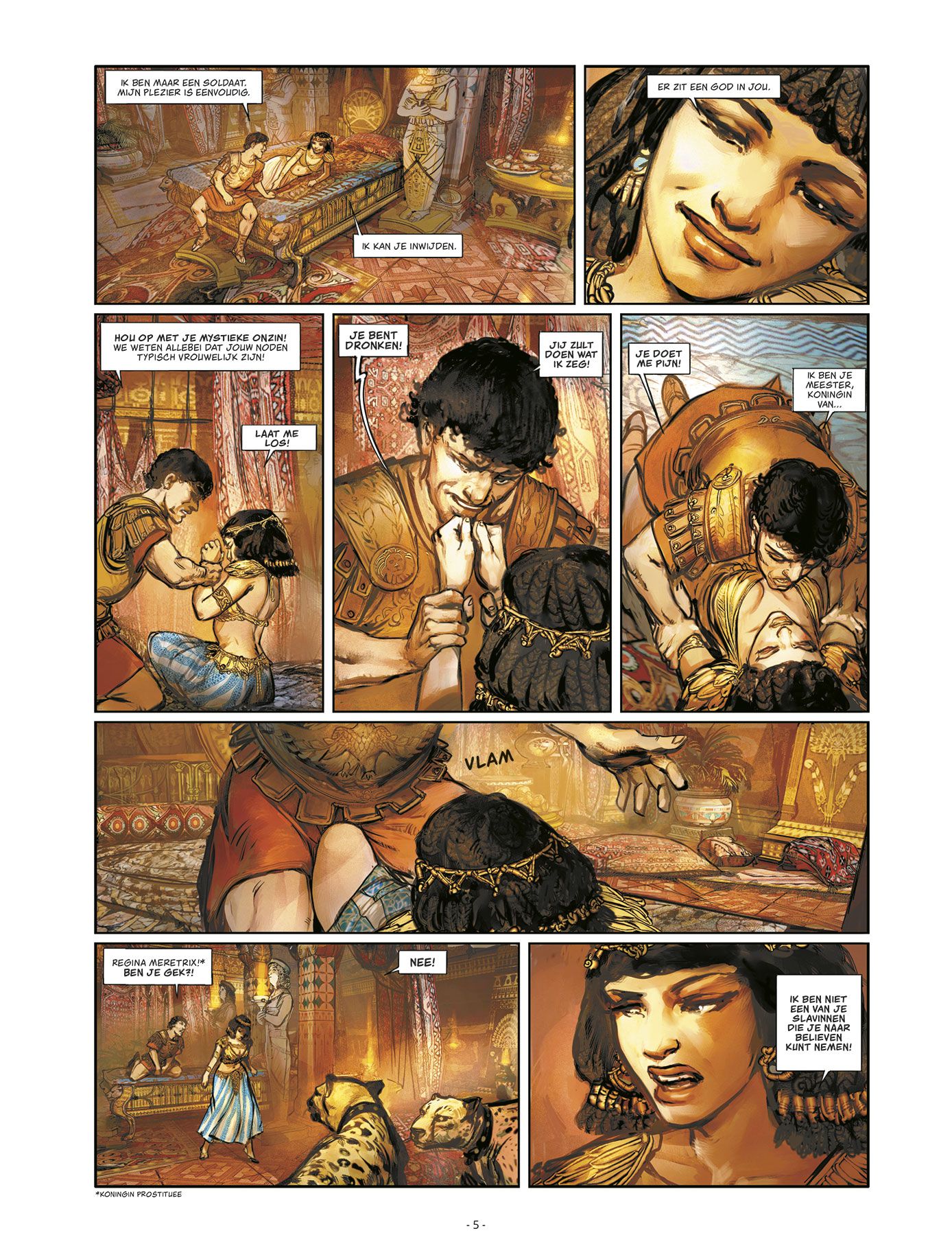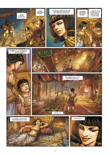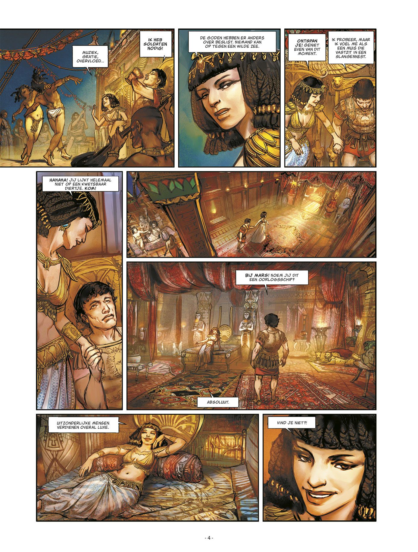 Vierde deel van de Bloedkoninginnen-reeks die in het Frans al vier albums telt. Er valt dan ook veel te vertellen over de Egyptische heerseres Cleopatra. - De reeks rond Cleopatra was oorspronkelijk gepland in drie delen, maar er valt zoveel te vertellen dat de reeks is verlengd... - Thierry Gloris en Joël Mouclier brengen samen het leven van Cleopatra (en haar Romeinse aanbidders) getrouw, gedetailleerd en groots in beeld! Cleopatra en Marcus Antonius hebben ruzie, maar ze hebben elkaar ook nodig in hun waanzinnige streven naar roem. De consul, met zijn grootse ideeën, schenkt de eeuwige koningin van Egypte een cadeau dat ze niet kan weigeren. Zo bezegelen ze hun lot en stevenen ze af op een onvermijdelijk einde. Over de meest legendarische Egyptische farao valt ongelooflijk veel te vertellen, en dat merk je ook in onze collectie Bloedkoninginnen: er is intussen een vijfde deel aangekondigd over Cleopatra. Thierry en Marie Gloris duiken diep het Romeinse en Egyptische hofleven in om een waarheidsgetrouwe, spannende en bloedige weergave te geven van het leven van de Egyptische heerseres. De sfeer in de albums is onheilspellend, sexy, oosters... allemaal te danken aan Joël Mouclier. Op naar het volgend album, en eeuwige roem!