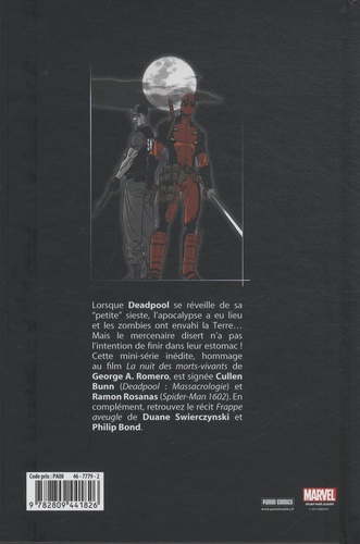 Après une violente indigestion, Deadpool sort du coma et découvre que l'apocalypse a eu lieu ! Les zombies ont envahi le monde... et le mercenaire ne souhaite pas finir dans leurs estomacs. Cullen Bunn, l'auteur de la Deadpool Massacrologie, vous présente le plus sombre récit dédié à Deadpool, dans la lignée de la Nuit des Morts Vivants de George Romero.