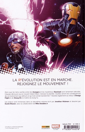 Alors que les liens cachés entre les Avengers et les mystérieux Illuminati sont lentement dévoilés, l'équipe découvre qu'un nouvel Instant Blanc menace la planète. Quelles seront les conséquences de cet événement qui détruit ce qu'il est censé transformer ? Assistez également au retour d'Omega Flight et de Shang Chi, le maître du kung-fu. Les enjeux sont immenses dans ce deuxième volume écrit par Jonathan Hickman et dessiné par Dustin Weaver, avec la collaboration de Mike Deodato Jr.