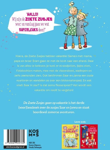 Le livre 'Les Douces Sœurs partent en vacances' nous emmène avec les Zoete Zusjes dans un voyage vers une île magnifique. Est-ce qu'on y parle néerlandais ? Peu importe, tant qu'il y a plein de choses à faire ! Comme ramasser des trésors sur la plage, manger des glaces, faire du vélo, monter à bord d'un bateau de pêche, faire du wadlopen et même observer des phoques. Avec papa, maman et leur frère Bram, Saar et Janna grimpent au sommet d'un vieux phare, marchent sur un sentier pieds nus et visitent le musée des chasseurs d'épaves. Et que trouve Saar dans la mer ? Serait-ce un message dans une bouteille ? Ce sera des vacances inoubliables !