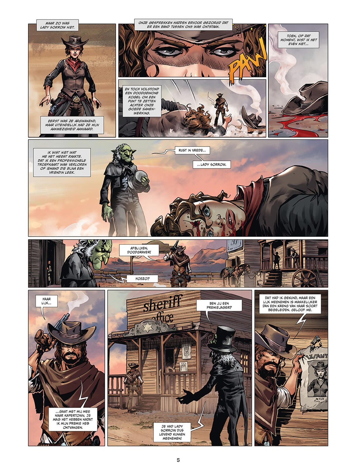 QUAND L'ESPRIT DE TARANTINO RENCONTRE LA MAGIE DE TOLKIEN. UN VOYAGE A COUPER LE SOUFFLE OU LA BRUTALITE DU WESTERN RENCONTRE LA MAGIE DE LA FANTASY ! Okaar Albericht, un nain chercheur d'or, sa mélancolie comme seule compagne, tombe sur un monolithe gigantesque, un artefact imprégné de magie au fond de sa mine. Lorsque sa main touche malencontreusement l'objet, il déclenche un événement à des milliers de lieues de là : l'homme en noir, nécromant maudit, sort de sa tombe, attiré comme un aimant par le totem et par les ténèbres qui rongent Okaar. Sur son passage, les morts se lèvent, formant une armée avide. Mais ce n'est pas tout ! Un chasseur de primes impitoyable, Kendal Jones, porté par une vengeance viscérale, en compagnie d'un gobelin croque-mort, se mettent en route vers cette fameuse mine d'or. Une symphonie de sang, de flingues et de sorcellerie est sur le point de s'abattre ! ...