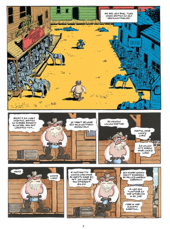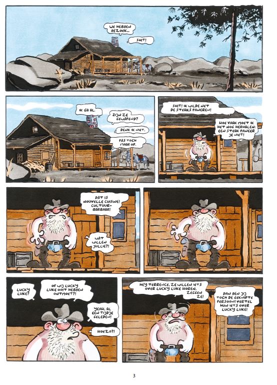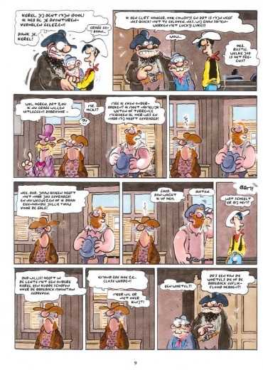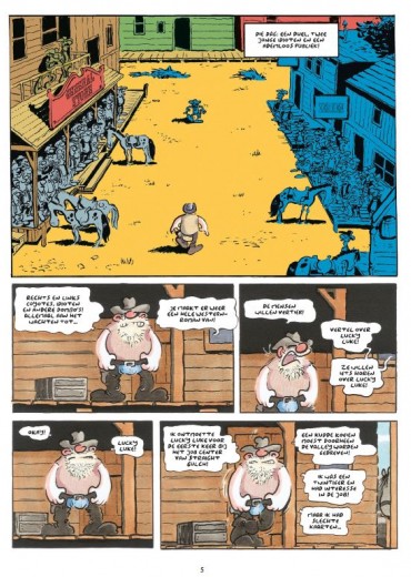 Score moyen 3 / 5Dit album is al de 5de hommage in rij aan Lucky Luke, wat getuigt van het succes van deze nevenreeks. Ditmaal is Ralf König aan zet aan de tekentafel en als scenarist. Deze succesvolle Duitse stripmaker was als kind al grote fan van Lucky Luke en zelfs verliefd op de stripfiguur. Deze verliefdheid trekt hij letterlijk door in dit album, maar dan op andere vlakken. Laten we eerst even iets prijs geven over het scenario: dit wordt verteld vanuit het standpunt van een cowboy Bud die samen bij een andere cowboy (Terrence) inwoont. Later wordt duidelijk dat dit liefdespartners zijn. Bij het wachten aan een jobcenter avant la lettre ontmoet Bud Lucky Luke. Lucky Luke krijgt hierbij de opdracht om 5 lila koeien te transporteren naar een rustiger omgeving. Daarbij neemt hij Bud mee als buddie om de koeien te begeleiden. Daarbij doet Bud zijn (liefdes)verhaal van de hand aan Lucky Luke. In het verhaal komen Calamity Jane en de Daltons ook nog opdraven om hun steentje bij te dragen. Maar het blijft jammer genoeg bij een klein keitje, want de nadruk ligt in dit verhaal teveel op het duo Bud-Terrence. Het is leuk én goed dat een maatschappelijk thema rond holebi’s aangesneden wordt (de auteur zelf is ook homo trouwens), maar daardoor wordt de hommage aan Lucky Luke zelf naar de achtergrond gedrongen. De cover spreekt daarbij boekdelen: het duo steelt de show, terwijl Lucky Luke erbij stond en keek. Los daarvan is dit een aangenaam album om lezen. De tekenstijl is eenvoudig en is in cartoonstijl, wat past met de nodige humor die aan bod komt. Want die is er in overvloed en ze werkt: veel gekker dan lila koeien (‘melkbussen’ volgens Calamity Jane) die elk hun eigen naam hebben, en de persoon Nes Quick die erbij hoort, kan het niet worden. Een leuk tussendoortje, enkel jammer dat Lucky Luke met losse flodders schiet in dit verhaal.