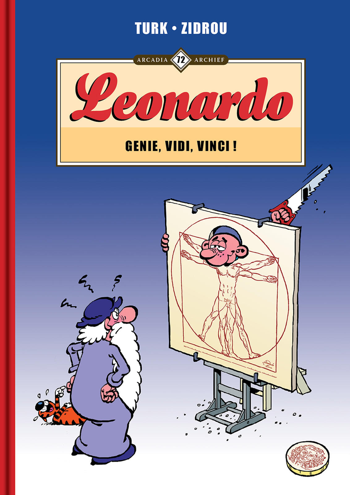 'Leonardo is een genie! Tenminste, dat denkt hij en vindt hij van zichzelf! De lezer vaart er wel bij, want hij krijgt in het nagelnieuwe Arcadia-album Genie, Vidi, Vinci! opnieuw een hilarische karikatuur van de illustere Leonardo da Vinci, bekend om zijn portretten van dames met een raadselachtige glimlach, voorgeschoteld! Stripheld en gedreven uitvinder Leonardo tovert als vanouds de meest waanzinnige machines uit zijn mouw en experimenteert ermee op zijn trouwe leerling. Een vrijwillig lot waarbij de arme leerling onvermijdelijk wordt bedekt met builen en bulten. In 2019 vierde Leonardo in de Franstalige editie zijn vijftigste album, en dat op de dag dat de enige echte Leonardo da Vinci vijfhonderd jaar geleden het tijdelijke voor het eeuwige inruilde. Tekenaar Turk en scenarist Zidrou hebben in dit nieuwe album de smaak aardig te pakken en laten door middel van hilarische situaties, een ware oscar-uitreiking, een stoutmoedige dievenbende en nog veel meer absurde toestanden de nodige lachsalvo’s noteren. Dat stemt ons ten huize Arcadia meer dan tevreden!'