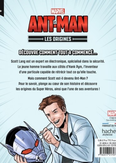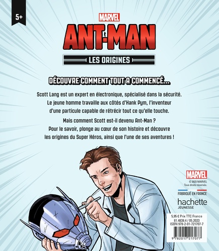La collection d'histoires sur l'origine des Super Héros et Héroïnes Marvel ! Un album illustré de 48 pages pour tout savoir sur ton personnage Marvel préféré. Plonge au coeur de l'histoire de Ant-Man et découvre comment il est devenu l'un des nouveaux Avengers ! Le plaisir de la lecture continue avec une de ses aventures inédites. Dès 6 ans. L'histoire : Scott Lang est un expert en électronique, spécialisé dans la sécurité. Le jeune homme travaille aux côtés d'Hank Pym, l'inventeur d'une particule capable de rétrécir tout ce qu'elle touche. Mais comment Scott est-il devenu Ant-Man ? Pour le savoir, plonge au coeur de son histoire et découvre les origines du Super Héros, ainsi que l'une de ses aventures !