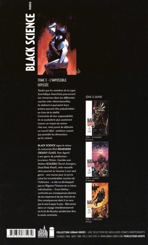 Tandis que les membres de la Ligue Scientifique Anarchiste poursuivent leur immersion dans les différentes couches inter-dimensionnelles, ils réalisent à quel point leurs actions peuvent être préjudiciables au tissu de la réalité. Conscients de leur responsabilité, ils ne souhaitent plus seulement trouver un moyen de rentrer chez eux, mais jurent de défendre un nouvel idéal : améliorer autant que possible les dimensions qu'ils visitent. Black Science signe le retour du scénariste Rick Remender (Deadly Class, Fear Agent) à son genre de prédilection : la science-fiction. Cocréée avec Matteo Scalera (Secret Avengers, Dead Body Road), cette nouvelle série pourrait se résumer à son seul genre - une course pour la survie entre les innombrables couches de l'Infinivers - si elle ne développait pas en filigrane l'histoire de ce héros individualiste - Grant McKay - confronté aux conséquences directes de ses croyances et de ses choix de vie. Des conséquences dont il ne sera pas le seul à payer le prix... Bienvenue dans un voyage interdimensionnel où la loi de Murphy semble bien être la seule constante.
