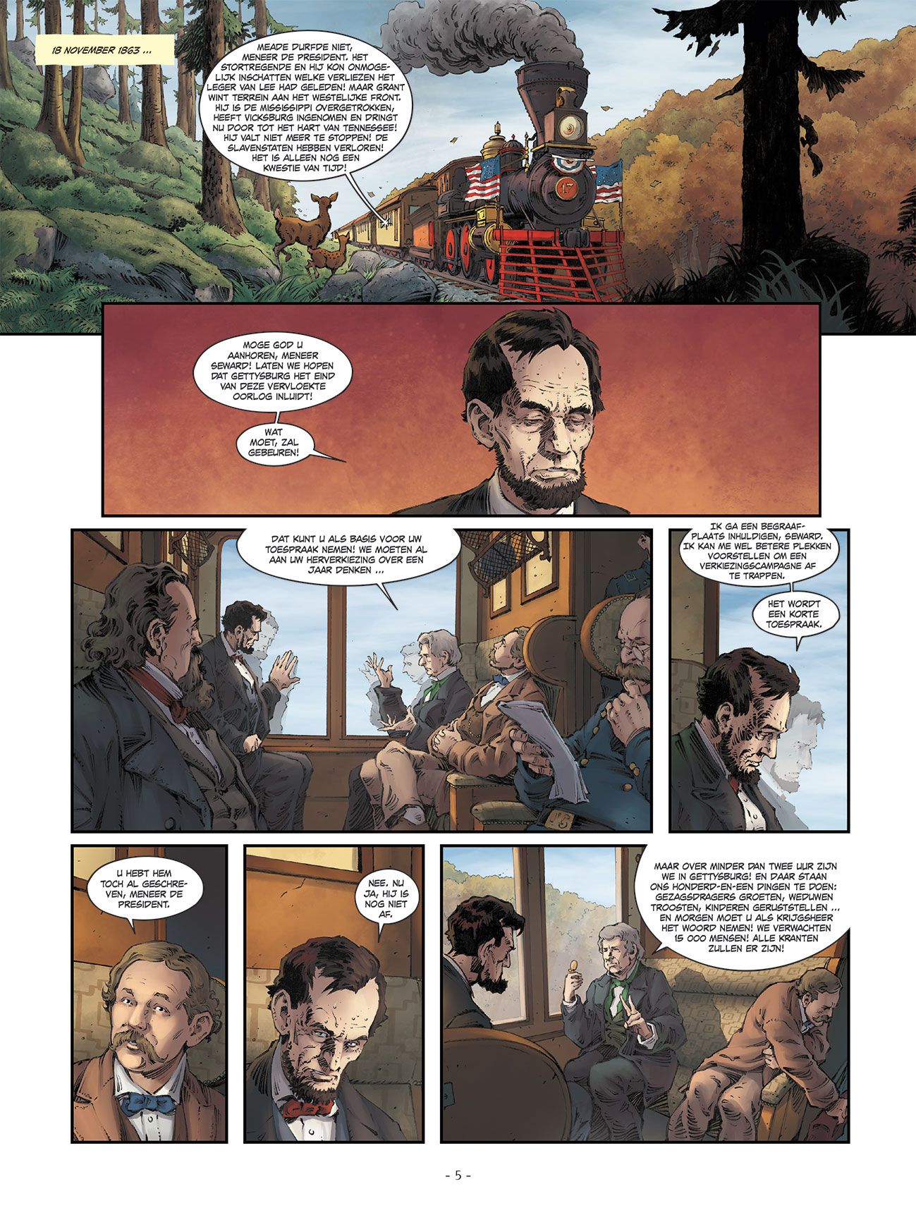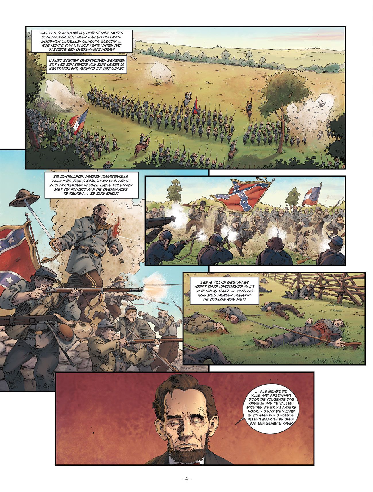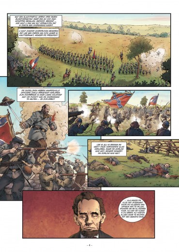 Striptekenaar Meli roberto ( Italië, °1974) tekent hier zijn debuut op de Nederlandse markt. Een tekenaar waar we nog heel wat zullen van horen en/of zien in de toekomst.... Nieuw deel in de collectie ‘Zij schreven geschiedenis’ • Elk album vertelt het verhaal van een markante figuur uit de wereldgeschiedenis, met uitgebreid dossier! • Met Lincoln ontdekken we het leven van een van de grootste presidenten van de Verenigde Staten, die bekendstond om zijn oprechtheid en zijn welsprekendheid • Scenario van Fred Duval • Gelimiteerde hardcovereditie 1863, Gettysburg. Op de vlaktes van Pennsylvania heeft het bloed van meer dan 50 000 Amerikanen gevloeid, de Noordelijke troepen hebben er een kapitale overwinning geboekt. Maar tegen welke prijs? Wanneer hij er een militair kerkhof opent, mijmert Abraham Lincoln, zestiende president van de Verenigde Staten, tijdens een historische speech over de Union, over de broosheid van het leven en over zijn eigen leven: over zijn ongelukkige kindertijd in de prairies van het Midden-Westen tot het Witte Huis, langs zijn grote pleidooien als rondreizend advocaat en zijn politieke aspiraties. Via flash- backs volgen we zo het parcours van een briljant, integer en door en door humanistisch man.