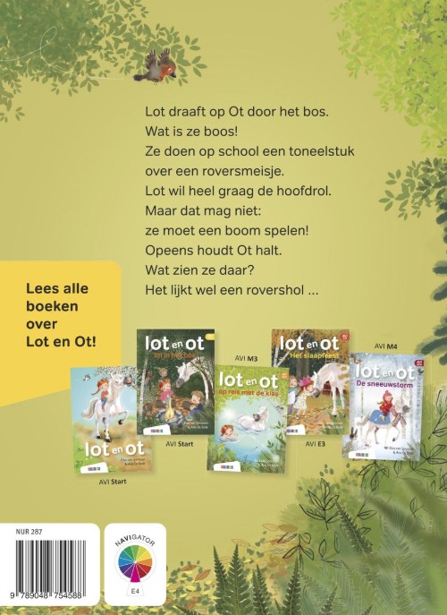 Retrouve une nouvelle aventure pleine de suspense, d’humour et d’émotion avec Lot et son fidèle cheval Ot. Lot et Ot – les six brigands est le sixième tome de cette série de livres jeunesse très appréciée. Dans cet ouvrage de niveau AVI E4, Lot est déçue de ne pas avoir obtenu le rôle qu’elle voulait. Mais une promenade à cheval change tout… Et si elle devenait tout de même une vraie fille des bois ? Découvre-le dans ce récit vivant de l’autrice Elisa van Spronsen, illustré à chaque page par un magnifique dessin d’Ann De Bode.