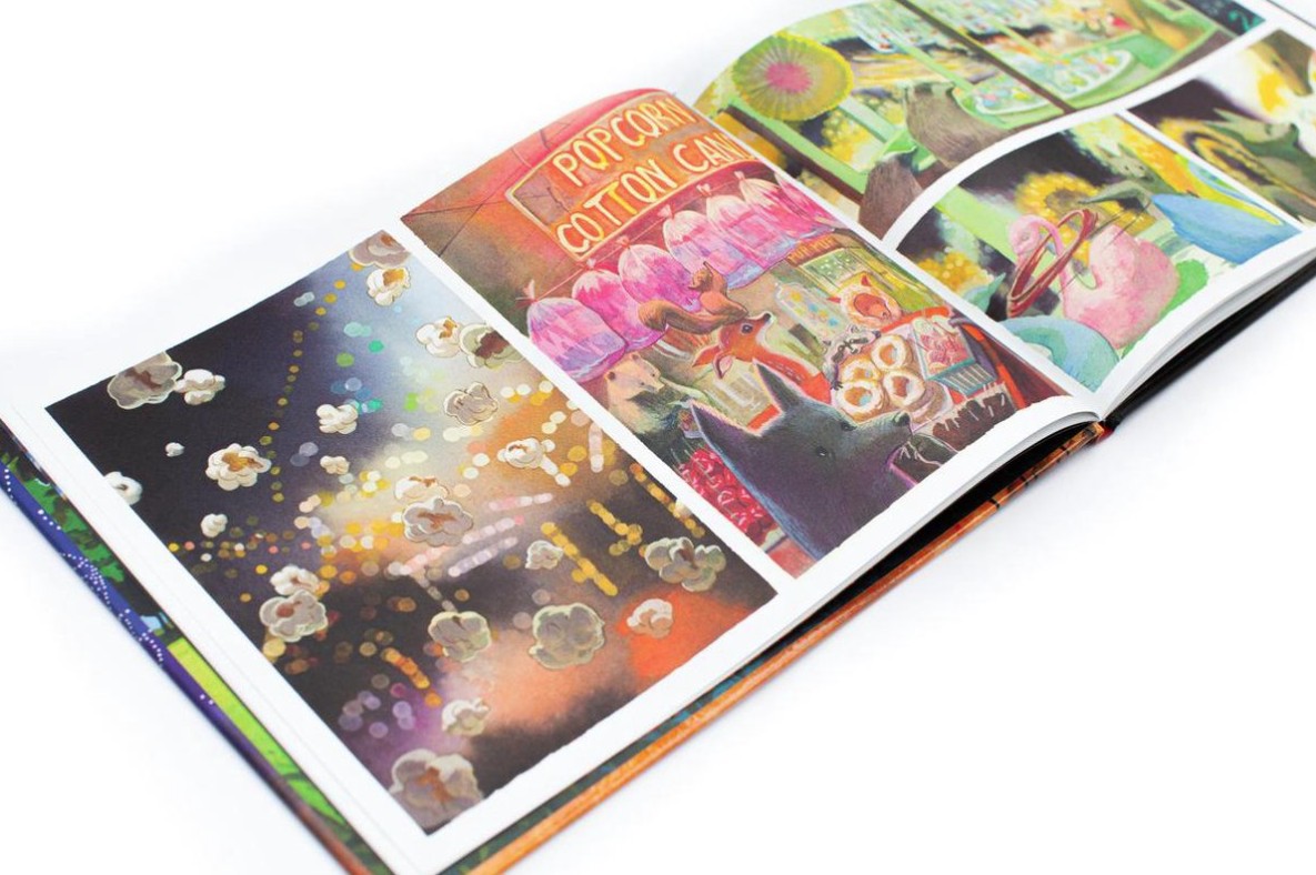 Un raton laveur courageux tire sur un levier et… toutes les lumières se rallument ! Le grand huit se remet à tourner, et les animaux s’emparent des attractions.