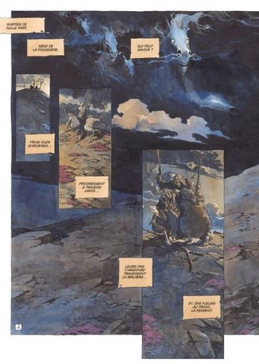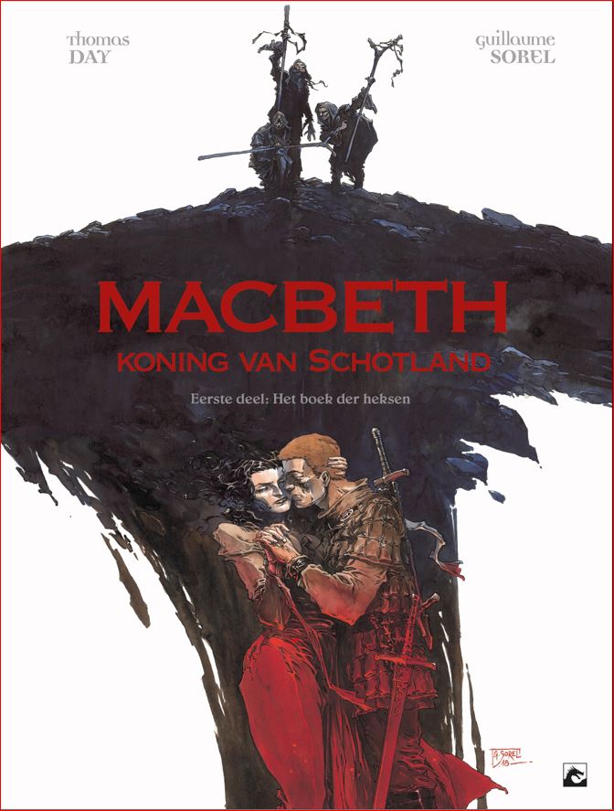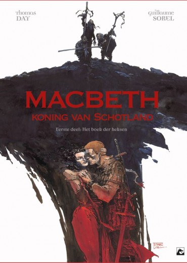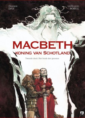 Score moyen 5 / 5XXL - koningsdrama Ja, we kunnen moeiteloos enkele klassiekers van William Shakespeare opsommen. Hamlet, Romeo en Julia, Othello, King Lear, Much Ado About Nothing en natuurlijk Macbeth. Ja, we weten dat deze renaissancist rond 1600 leefde in het Engelse Stratford-upon-Avon. En ja, we weten zelfs dat hij van The Sandman zelve zijn literaire inspiratie heeft mogen ontvangen. Hakijk maar eens naar aflevering 6 van die tv-reeks! Maar we moeten ootmoedig erkennen dat we nog niets van de man hebben gelezen. Meer nog, we krijgen het op onze heupen van zijn snel uitgesproken verzen die te veel informatie bevatten voor ons pathetisch breintje. Maar nu is er een verstripping van hét koningsdrama Macbeth met tekeningen van Guillaume Sorel! Genoeg om ons overstag te doen gaan. Net als in zijn opvallende comebackstrip Bluebells Wood is de Normandiër Sorel weer in grote doen. Zijn mystieke overdadige schilderstijl à la Caspar David Friedrich is ideaal om dit koningsdrama over te brengen op papier. De gebaren zijn er net iets te wijds, de tranen lopen er net te ver uit, de zwaarden kletteren er net te heldhaftig. Dit grafische toneel is larger than life. Sorel benut elke pagina maximaal. Paginabrede prenten worden gecombineerd met opvallend lange verticale prenten. Elke emotie wordt zo perfect uitgesmeerd. Thomas Day verwerkte de barokke tekst tot een stripverhaal. De plot is ijzersterk. De Schotse krijgsheer Macbeth komt na alweer een gewonnen veldslag drie heksen tegen. Ze zeggen dat hij tot Mormaer benoemd zal worden door de koning, dat hij zal huwen met een dame met rode handen en uiteindelijk koning zal worden. Maar tevens dat hij kastanjes zal eten, zal handelen als een rat en een varken zal doden. De onversaagde Macbeth is totaal van slag. Nog maar pas had hij Gruoch, de weduwe van Moray, gewroken door haar de hoofden van de moordenaars van haar man voor haar voeten te werpen. Emotieloos pakte ze de lugubere trofeeën in haar handen. Haar ijskoude ogen keken hem aan. Het bloed droop van haar handen. De dame met de rode handen. De bloedkoningin. Maar een plot wordt ook gedragen door dialogen. De Parijzenaar Thomas Day, die als Cid Vicious ooit medestichter was van de Razzies — een Franse literaire prijs die geïnspireerd is op de Razzie Awards die jaarlijks de allerslechtste films bekronen — slaat hier de bal toch wel mis. In het begin gebruikt hij de hoogwaardige verzen van Shakespeare. Deze — hoe mooi ook — doen je traag lezen, maar duwen zo de prachtige tekeningen naar de achtergrond. Het evenwicht is zoek. Enkele pagina’s verder schakelt hij over naar spreektaal die het straffe verhaal keihard vooruit stuwt om dan terug naar de brontekst te gaan. Dit gebrek aan rechtlijnigheid komt soms wat verwarrend over. Geef ons maar de straffe plot in hedendaagse dialogen. Maar kan je wel een strip uitbrengen over de ultieme taalvirtuoos door zijn teksten te negeren? Kan je de kool en de geit sparen? Hoe dan ook, deze Macbeth is terecht de naam klassieker waard én de bron waaraan Game of Thrones, Neil Gaimans The Sandman en andere Thorgals zich hebben gelaafd. Eindelijk kennen we het hele verhaal. Macbeth. 500 jaar oud en nog steeds beklijvend. Prima verstripping. (ssz)