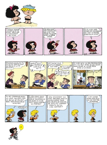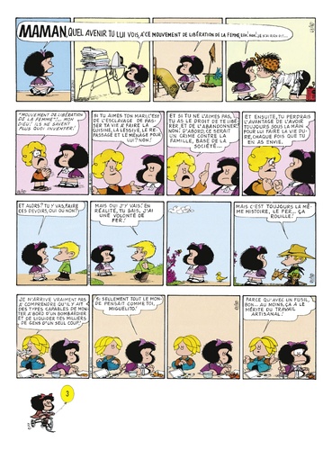Mafalda, 46 ans, toutes ses dents et toujours aussi fraîche et impertinente ! On ne présente plus Mafalda, petite fille qui découvre la vie, ses joies, ses absurdités et ses horreurs. A travers l'éveil d'un enfant, Quino nous livre sa réflexion sur le monde et sur l'étrange animal qui le peuple : l'être humain. Quino donne naissance à Mafalda en 1964, personnage contestataire et anticonformiste de 10 ans, qui fera de lui un dessinateur mondialement reconnu. Les éditions Glénat poursuivent la réédition complète de cette série emblématique avec une nouvelle maquette sans aucun doute attrayante pour toutes les générations ! Petit bonus pour les inconditionnels, bibliophiles ou collectionneurs : cette réédition des aventures de Mafalda une fois complétée avec les 12 tomes, les tranches de tous les tomes rassemblés composent un dessin décoiffant !