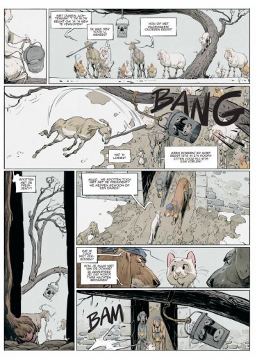 Verzet door geweldloosheid. De winter houdt de burcht in haar greep. Het weer spaart de inwoners niet, en ondertussen blijft president Silvio angst zaaien… Maar de strijd van Miss B en haar vrienden, César het konijn en Azelar de rat, is nog niet gestreden. Hun beweging, ‘de Margrieten’, blijft ijveren voor een beter leven: ze zeggen nee tegen de verplichting een halsband met belletjes te dragen en eisen gratis hout voor alle dieren. Om hun stem te laten horen, trotseren de moedige gezellen elke nacht de koude om een sit-in te houden voor de ramen van Silvio. Maar Miss B gelooft dat de dictatuur alleen verslagen kan worden als ze niet toegeven aan de verleiding van het geweld. Slaagt ze erin haar vrienden te overtuigen van geweldloos verzet? Het belooft een hele uitdaging te worden… Beestenburcht de revelatie voor 2020. Een dierenstrip, ja maar niet zomaar een dierenstrip. Een strip gebaseerd op het thema “geweldloos verzet “ die Dorisson terug vond bij Ghandi, Srdja Popovic ( de man die aan de basis lag van de val van Milosevic) en het boek “ La Désobeissance Civile “ van H.D.Thoreau uit 1849. Uiteraard is een vergelijk met de Boerderij der dieren van George Orwell, niet ver weg en is de inspiratie daar ontstaan. Toch wil de strip de frustratie van dit boek verwerken, namelijk “een revolutie die is geboren met goede gevoelens en geweld eindigt meestal door een dictatuur erger dan degene die ze wilde bestrijden”. Door dieren te gebruiken in dit verhaal, die een universele draagkracht hebben, kunnen zware en vreselijke gebeurtenissen verteld worden met een vleugje humor. Het verhaal gaat dus vooral over de leven onder een dictatuur, in dit geval “Silvio” de stier die over het kasteel heerst samen met zijn waakhonden en zwijnen. Alle thema’s ( Corruptie, wraak, opstand, onrecht, geweld, frustratie,…) komen hier aan bod op een bijzonder originele manier en vooral door zeer charmante personages zoals bv Miss Bengalore de kat. U leest het al, niet zomaar een strip, Dorisson wil de lezer vooral attent maken dat geweld, zelfs uitgelokt, een slechte raadgever is en meestal leidt tot meer geweld. Niet moraliserend doch steeds reflecterend naar een goede democratie en een beschermende, sociale maatschappij laat Dorisson de lezer nadenken over onze samenleving en hoe het er in de wereld aan toe gaat. Tekenaar Felix Delep levert hier zijn debuut én wat voor één. Dorisson vroeg aan Casterman om een tekenaar in de stijl van Milt Kahl en een vriend zei hem om eens een kijkje te nemen op de site van Felix en daar was de keuze vlug gemaakt. WAT EEN TALENT! Zijn tekenstijl is bijzonder vloeiend, met zin voor detail, warm en doet soms denken aan Guarnido. Felix is 25 jaar en ondertussen reeds gestart aan deel 2. Deel 1 nam wat meer tijd in beslag door het zoeken naar de juiste manier van tekenen. Het verhaal zal uit 4 delen bestaan en is reeds volledig geschreven. Een strip die uiterst doordacht en origineel is, zeker een topper in wording. Verschijnt in Hardcover en softcover (72 blz.). Hardcover schrijf je best in op voorhand want deze zal terug direct uitverkocht zijn. Ergens in Frankrijk tussen de twee wereldoorlogen, genesteld in het hart van een boerderij vergeten door mensen, wordt het dierenkasteel geleid door een ijzeren schoen door president Silvio ... gedetacheerd door een hondenmilitie, de dictator stier exploiteert de andere dieren, allemaal gedwongen om uitputtende inspanningen te leveren voor het welzijn van de gemeenschap ... Miss Bangalore, angstige kat die alleen probeert haar twee kleintjes te beschermen, en Caesar, een konijn gigolo, gaan samenspannen met de wijze en mysterieuze Azelar, een brilrat om weerstand tegen onrecht te bepleiten, strijd tegen hoektanden en klauwen door ongehoorzaamheid en gelach ... Eerste deel van een serie gepland in vier delen, De Animal Castle bezoekt de Farm Animals van George Orwell (1945) opnieuw en nodigt ons uit voor een veelheid aan reflecties, soms zeer actueel ...