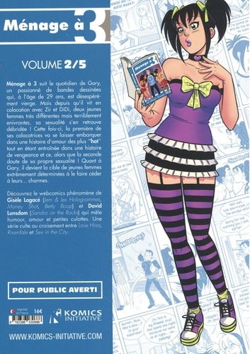 'Ménage à 3' suit le quotidien de Gary, un passionné de bandes dessinées qui, à rage de 29 ans, est désespérément vierge. Mais depuis qu'il vit en colocation avec Zii et DiDi, deux jeunes femmes très différentes mais terriblement enivrantes, sa sexualité s'en retrouve débridée ! Cette fois-ci, la première de ses colocatrices va se laisser embarquer dans une histoire d'amour des plus "hot" tout en étant entraînée dans une histoire de vengeance et ce, alors que la seconde doute de sa propre sexualité ! Quant à Gary, il devient la cible de jeunes femmes extrêmement déterminées à le faire céder à leurs... charmes. Découvrez le webcomics phénomène de Gisèle Lagacé (Jem & les Hologrammes, Money Shot, Betty Boop) et David Lunsdom (Sandra on the Rocks) qui mêle humour, amour et petites culottes. Une série culte au croisement entre Love Hina, Riverdale et Sex in the City.