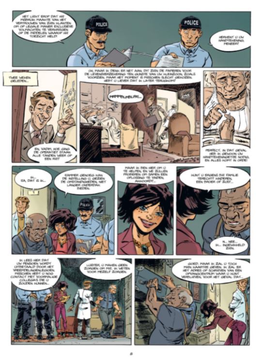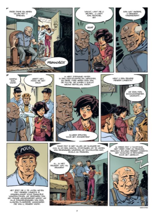 Laten we maar beginnen met te melden dat deze nieuwe reeks niet handelt over de Franse regisseur met dezelfde naam als het hoofdpersonage! Deze reeks speelt zich dan wel af aan de mondaine Cöte d’Azur, maar ze heeft helemaal niets met film te maken. De cover heeft al weer wat we mogen verwachten: we zien een oude man enkele gemaskerde mannen een straat overslepen. Die oude man is Vadim Kocsinskzy, zeg maar meneer Vadim, hij is een oud legionnair vn het vreemdelingenlegioen. Hij lijkt een bedaarde oude man waarvan het belangrijkste in zijn leven nog zijn dagelijkse soap op televisie is. Hij verloor zijn vrouw en dochter, en mag zijn kleinzoon niet meer zien. Als zijn zaakwaarnemer hem oplicht kan hij door de juridische mallemolen zelfs niet meer aan zijn eigen pensioen. Doordat hij zijn rekeningen niet meer kan betalen zet het home waar hij leeft hem aan de deur, hij krijgt alleen nog wat hulp van Stepanie Mayer, een jonge maatschappelijk werkster. Er zit er voor Vadim niets anders op dan weer werk en inwoning te zoeken. Met zijn laatste geld wil hij nog een iets gaan eten in een Belgisch eethuis, en dan gaan de poppen aan het dansen. Het restaurant wordt overvallen en het jachtinstinct van Vadim komt weer naar boven. Hij schakelt de overvallers een voor een uit. De overval blijkt een represaille te zijn van “de Drievuldigheid”, de lokale maffiabazen die het niet kunnen verkroppen dat de Belgische restaurant-eigenaar Bart Coppens ook voet aan de grond wil krijgen in het lokale drugsmilieu. Coppens vraagt aan Vadim om bij hem in dienst te komen om zo wraak te nemen op de Drievuldigheid. Met tegenzin aanvaard Vadim het werk onder enkele voorwaarden. Zo moet Coppens helpen om de oplichter op te sporen. Gihef (high security/complot) schotelt ons een interessante actie-thriller voor met enkele komische noten. Zo heeft Vadim wel nog zijn kennis en reflexen overgehouden aan zijn verleden, maar lijdt hij ook aan artrose, wat niet echt handig is als je plots begint te trillen als je iemand wil neerknallen of moet wegvluchten! De semi-realistische tekeningen van Morgann Tanco (het rechte pad, pagnol verstrippingen) passen perfect bij deze actiethriller! De cliffhanger op het einde van dit eerste deel laat ons vol spanning wachten op het vervolg, dat in het Frans is aangekondigd voor augustus. Laat ons hopend at Saga het vervolg nog dit jaar kan vertalen!