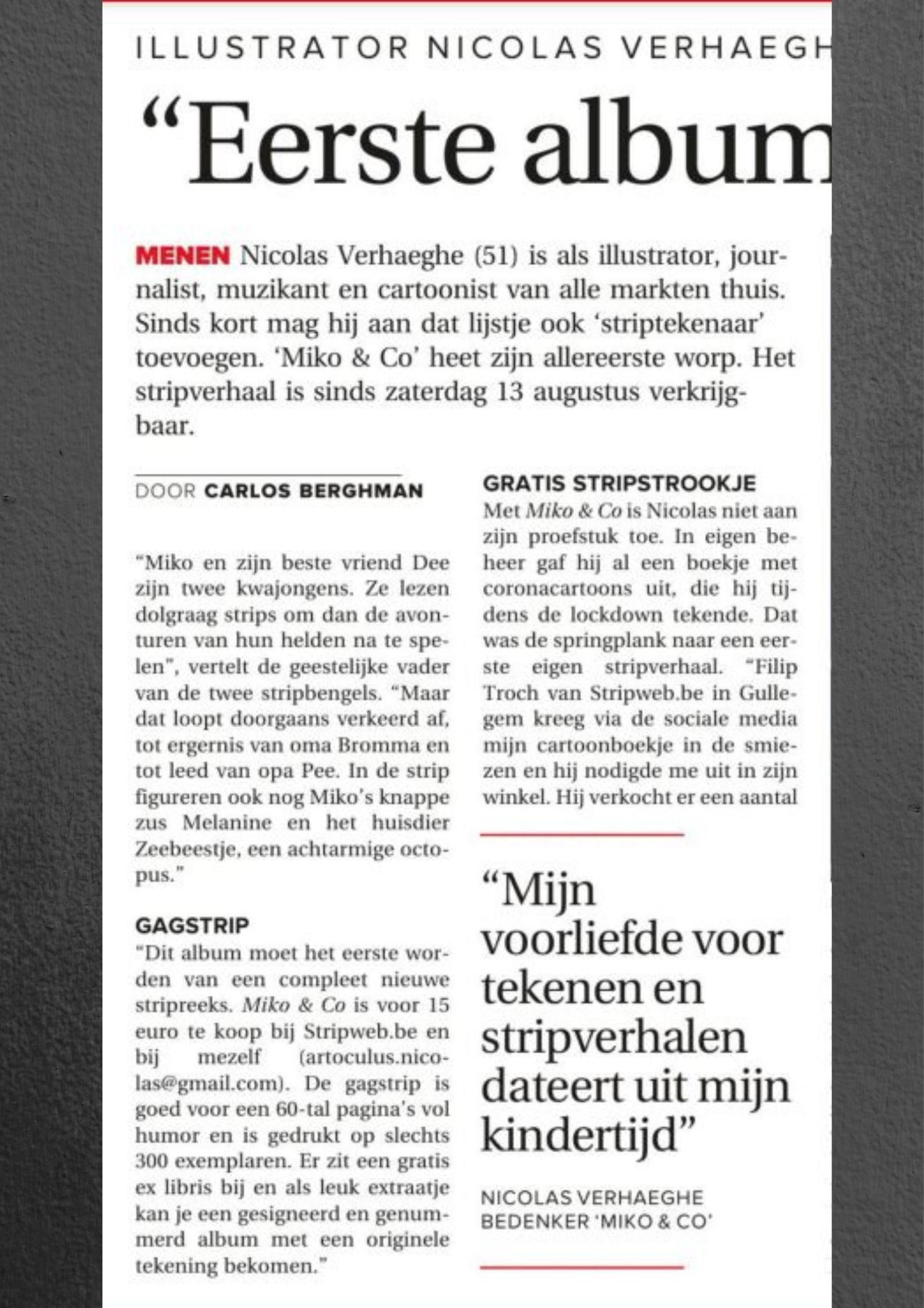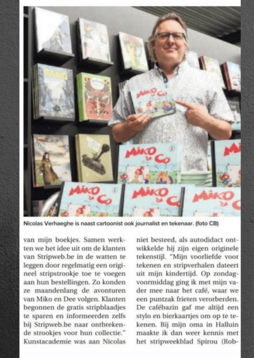Het eerste album van Miko & C°! dit stripalbum uitgevoerd in hardcover Italiaans formaat ( zoals de oude Guust Flaters) wordt gedrukt op slechts 300 ex met gratis ex-libris en zowel de strip als de ex-libris zijn gesigneerd door de auteur. het tweede album verschijnt volgend jaar en zal alweer héél wat humor bevatten. verschijnt NIET in softcover. NU AL EEN COLLECTOR ITEM EEN KLEINE SIGNEER TOURNEE VAN DE AUTEUR IS VOORZIEN