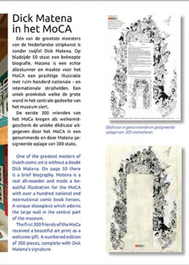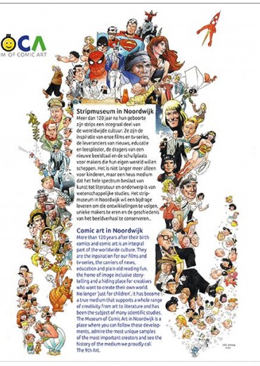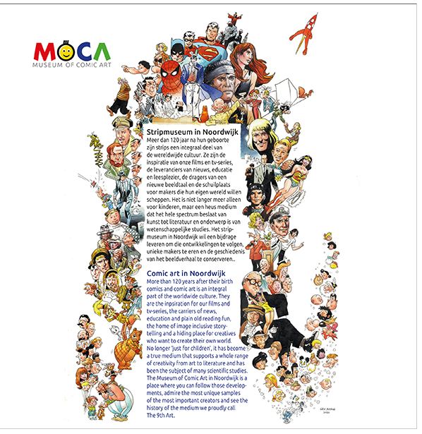 Van de eerste tentoonstelling in het MoCA, European Masters of Comic Art, is een rijk geïllustreerde catalogus gemaakt. De eerste tentoonstellingscatalogus van het MoCA in een hopelijk lange reeks. Deze unieke catalogus wordt eenmalig uitgegeven in een gelimiteerde oplage van 500 exemplaren. De uitgave is mede mogelijk gemaakt dankzij ondersteuning van het Rabobank Bollenstreek Coöperatiefonds. De luxe hardcover uitgave, genaaid gebonden – formaat 210 x 210 mm, bevat 192 pagina’s in kleur met afbeeldingen van alle tentoongestelde originelen en biografieën met veel informatie over de 77 tekenaars. Dick Matena verzorgde een speciaal voorwoord naast een prachtige illustratie met ruim 130 striphelden die speciaal voor het MoCA gemaakt is. Als bijlage bevat de boekuitgave een losse gesigneerde kunstdruk van Daan Jippes.
