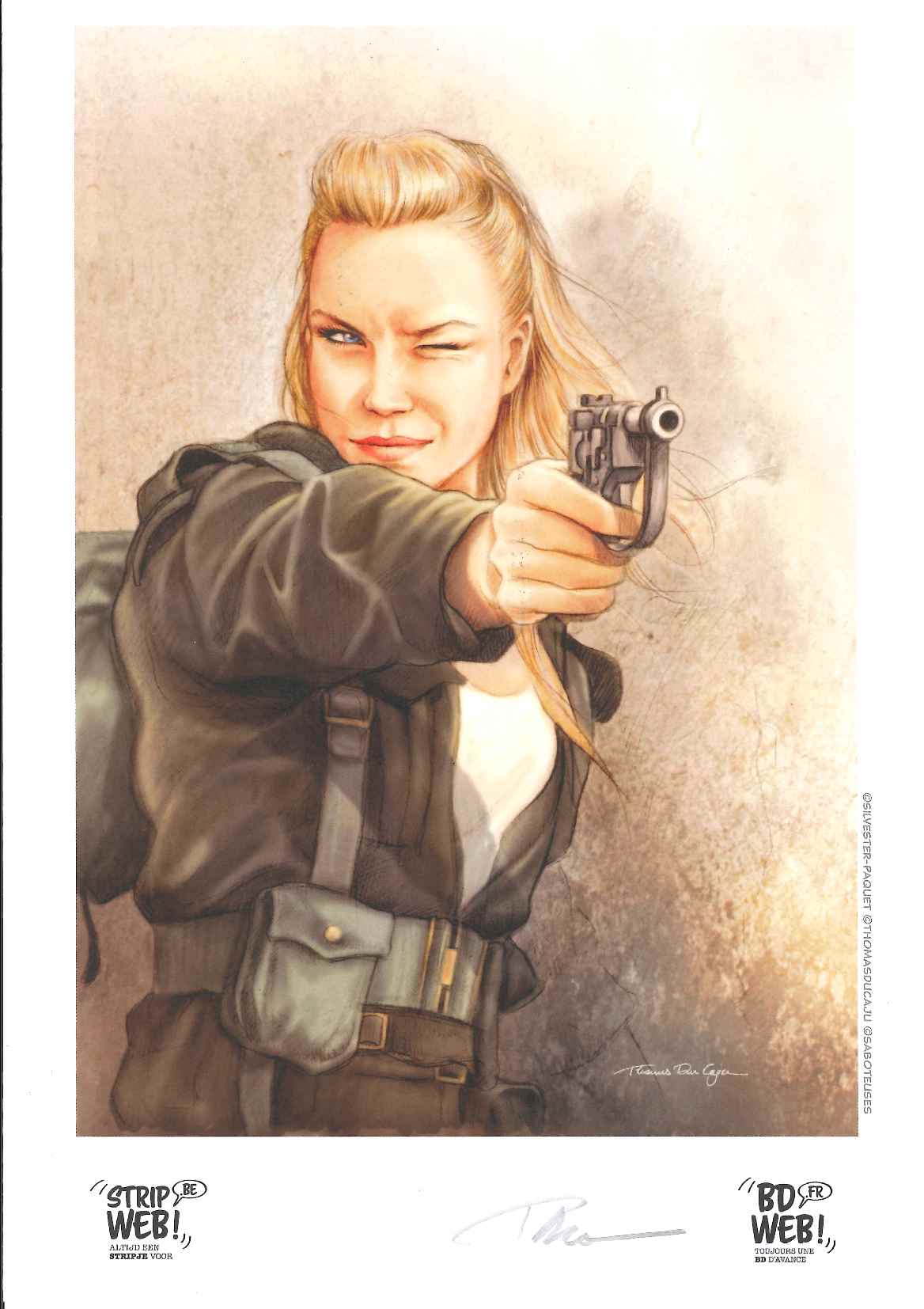 Saboteuses is geschreven door Jean-Claude Van Rijckeghem en getekend door Thomas du Caju (bekend van Vleugels van de Hoop). Beide auteurs werkten eerder samen aan de reeks Betty & Dodge. Ook verkrijgbaar als gelimiteerde Collectors Edition.