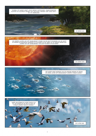 'In het begin schiep God de hemel en de aarde'. Met deze zin begint een van de belangrijkste basisteksten van onze joods-christelijke cultuur. Deze strip omvat een getrouwe, oecumenische adaptatie van de eerste 31 hoofdstukken van het Boek Genesis. Hierin komen aan bod: de schepping, Adam en Eva, Kaïn en Abel, de zondvloed en Noach, de toren van Babel, de vernietiging van Sodom, het offer van Abraham en de droom (de ladder) van Jakob. Het boek Genesis is opgesplitst in twee delen.
