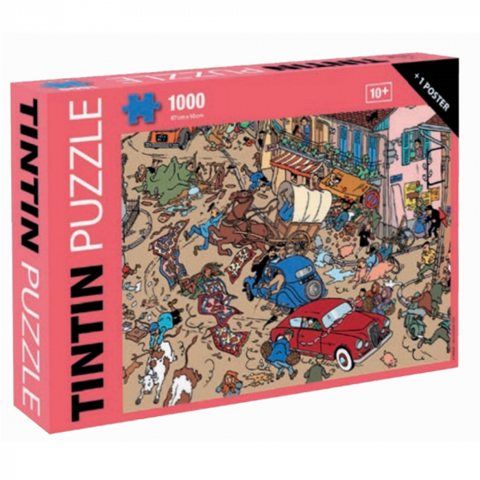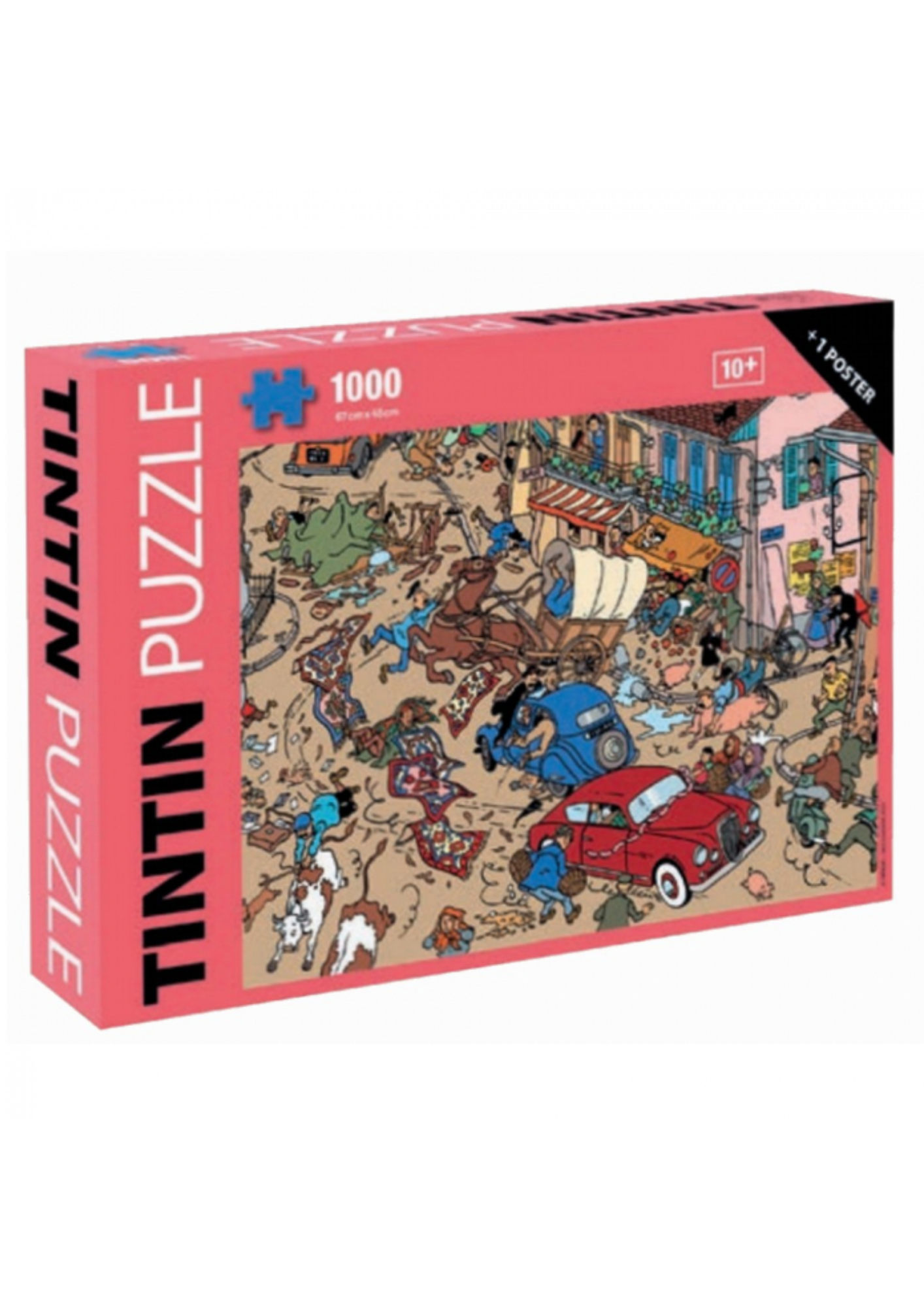 Ce puzzle Tintin de 1000 pièces représente l'accident sur la place. 50x66,5cm. Le Puzzle est accompagné d'un poster.