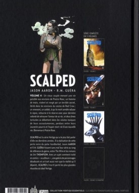 Il y a quinze ans, Dashiell Bad Horse a fui la pauvreté et le désespoir que lui promettait la réserve indienne de Prairie Rose. II est aujourd'hui de retour et fait le constat amer que rien n'a changé. Engagé dans la police tribale du chef Red Crow, futur propriétaire de casino et parrain de l'ensemble des trafics d'alcool et de drogue de la réserve, Dashiell a pour mission de faire passer aux traditionalistes l'envie de revendiquer leur ethnicité à coups de C4 et de limiter au maximum la prolifération des laboratoires de méthadone. Est-il de retour pour mettre de l'ordre ou tirer sa part du lion ? Scalped est la série Vertigo qui a le plus fait parler d'elle ces dernières années. À la réalisation de cette perle noire du polar hardboiled, Jason Aaron et R-M Guera hissent sans mal leur série au rang des références du genre, entre The Wire et les romans de Jim Thompson. Avec un sujet rarement traité en comics - ou ailleurs -, une galerie de personnages désabusés et un trait aussi noir que la réalité qu'il dépeint, Scalped s'inscrit parmi les plus grandes réussites du label Vertigo.