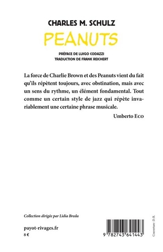 La force de Charlie Brown et des Peanuts vient du fait qu'ils répètent toujours, avec obstination, mais avec un sens du rythme, un élément fondamental. Tout comme un certain style de jazz qui répète invariablement une certaine phrase musicale. (Umberto Eco)