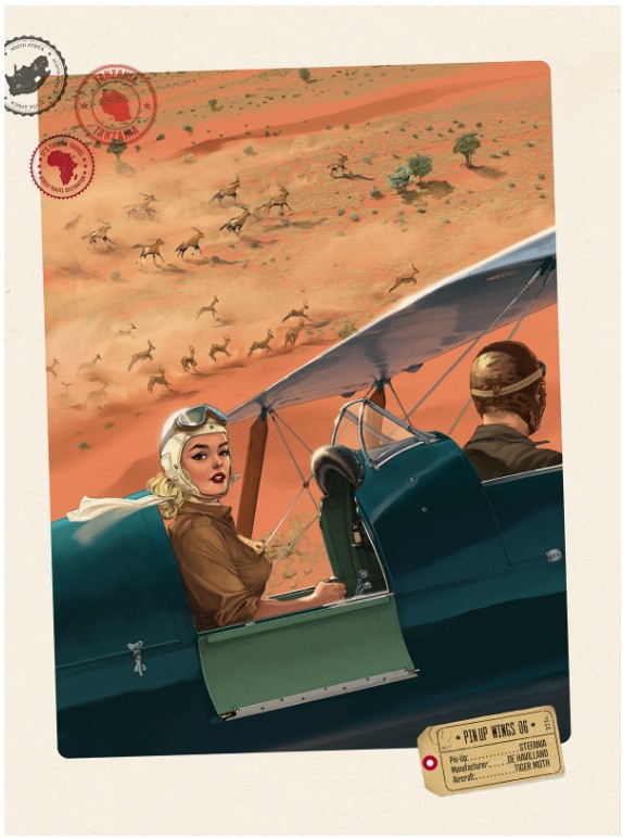 met exclusieve kunstdruk voor de eerste aankopers Als ware glamouriconen, zijn pin-ups onlosmakelijk verbonden met de geschiedenis van de luchtvaart, altijd synoniem voor avontuur en passie. Romain Hugault is, als echte fan van het genre, een virtuoos in deze kunst. Hij schept er plezier in om, tussen twee strippagina’s door, nieuwe illustraties te maken van deze altijd kokette, soms ondeugende, maar nooit ordinaire jongedames. Geschilderd op een vliegtuigromp, een vliegeniersjack of opgespeld in een cockpit, gaven ze de piloot een beetje moed, op het moment dat hij werd ondergedompeld in een gevaarlijke missie.