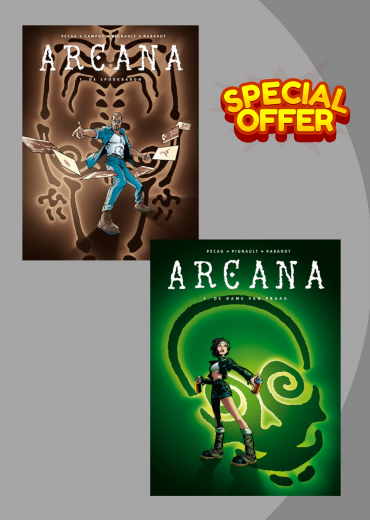 Dit voordeelpakket bevat hardcover 1 en 2 van Arcana: 1 - De spookbaron 2 - De dame van Praag Midden-Amerika. Een agent van Stargate heeft de boel verraden en is overgelopen naar de kant van de drugshandelaren. Miss Mood en Walter Duncan worden naar dat gebied gestuurd om dit probleem op te lossen. Maar die agent, ook bekend als de spookbaron, is misschien slechts een kleine pion in een veel grotere samenzwering... Arcana is een reeks van tien delen en speelt zich af in de wereld van De Verborgen Geschiedenis en Major Arcanum. Arcana speelt zich af in de tegenwoordige tijd. Stargate, een Amerikaanse geheime dienst, stuurt zijn agenten op ogenschijnlijk onmogelijke missies uit ... Het zijn missies waarop andere geheime diensten zijn stukgelopen. De kans op succes bij deze missies is gering: de agenten lopen een groot risico om nooit meer terug te komen. Maar die agenten hebben een geheim wapen. Ze kunnen het toeval beïnvloeden of zelfs manipuleren met speciale kaarten. Die kaarten lijken op gewone tarotkaarten, maar ondertussen ... De Arcana van Stargate verbergen nog veel andere geheimen. Walter Duncan is agent van Stargate. Zijn talent zit hem al heel lang dwars. Sterker nog, hij beschouwt zijn talent als een vloek. En niemand kan hem antwoord geven op zijn vragen. Miss Mood is ook agent van Stargate. Ze is de partner van Walter, en ze lijkt veel meer dan Walter te weten over de geheimen van Stargate. Miss Mood weet ook veel over Walter ... Dit kennispakket bevat de eerste 2 delen: 1. De spookbaron 2. De dame van Praag