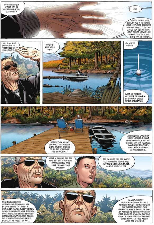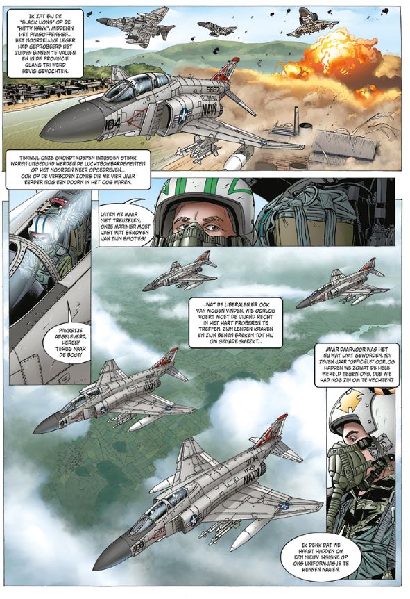 Michael Koeniguer kennen we vanBerlijn wordt ons graf. . Over de pagina's keert de gepensioneerde kolonel terug naar de luchtoperaties die in zijn hoofd zijn gegrift. Op basis van een perfect gedocumenteerd scenario laat de auteur een deel van de psychologische ontwikkeling van de hoofdrolspelers achter om volledige aandacht te schenken aan de vliegmachines die dan ook belangrijk zijn in deze reeks. Als de plot slechts enkele verrassingen bevat, terwijl militair jargon sommige mensen die niet vertrouwd zijn met dit genre, kan ontmoedigen, zouden de vele actiescènes liefhebbers van oorlogsverhalen moeten verrassen. Tussen luchtaanvallen, napalmbommen, zware artillerie en bombardementen of verkenningsmissies heeft de lezer geen tijd om zich te vervelen. Met een zeer realistische stijl stelt Michel Koeniguer een nauwgezet werk voor op het vlak van luchtvaartscènes en aeronautica. De tekeningen van de vliegtuigen (F-4 Phantom) zijn prachtig en gedetailleerd maar de karakters lijken soms moeilijk van elkaar te onderscheiden. Kolonel Bradley “Redneck” Towsend, 68 jaar oud, piloot bij de Marines, leeft teruggetrokken in zijn chalet in de Rocky Mountains. Door zijn ziekte vult hij zijn dagen met tv-nieuwsuitzendingen kijken, bezorgd zijn om zijn zoon die Apache-helikopterpiloot is in Irak. Als er zich een “kazernehulpje” aanbiedt, een jonge piloot die werd gestraft omdat hij in zijn overmoed een splinternieuwe F-22 in de prak heeft gevlogen, is dat voor de oude piloot een gelegenheid om herinneringen op te halen aan zijn tijd in het Verre Oosten, in Da Nang...