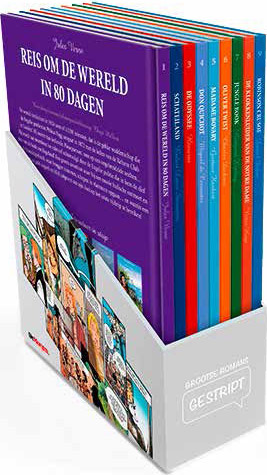 9 avonturenromans in stripvorm gebundeld in een box: Reis om de wereld in 80 dagen, Jungle Book, Oliver Twist, De klokkenluiden van de Notre Dame, Schateiland, Don Quijote de la Mancha, De Osyssee, Madame Bovary, en Robinson Crusoë. Topromans van wereldformaat omgezet in een stijlvol beeldverhaal.