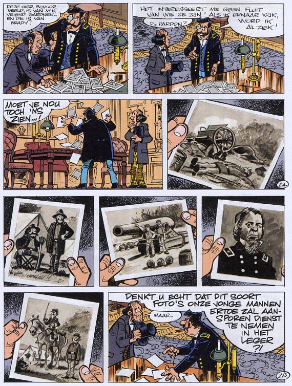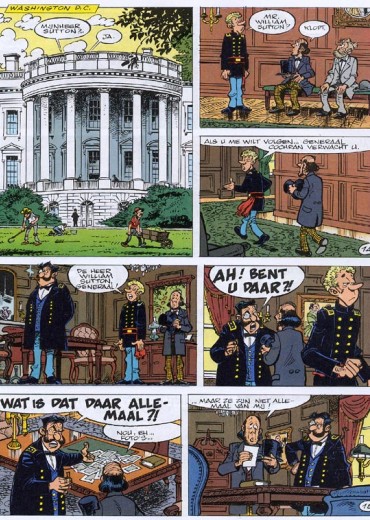 De reeks 'De Blauwbloezen' is een geslaagde mengeling van avontuur en humor. Cauvin gebruikt - zoals hij wel meer doet - historische anekdotes uit de Amerikaanse burgeroorlog om ons hilarische verhalen te vertellen over de perikelen in het leger, waar de hoogste officieren niet per se de slimste zijn... Willy Lambil heeft zich uitstekend gedocumenteerd en maakt van zijn pagina's heldere, intelligente kunstwerkjes. Het resultaat is amusement op hoog niveau, dat door een nog steeds groeiend publiek wordt gewaardeerd.