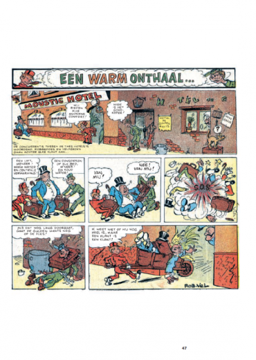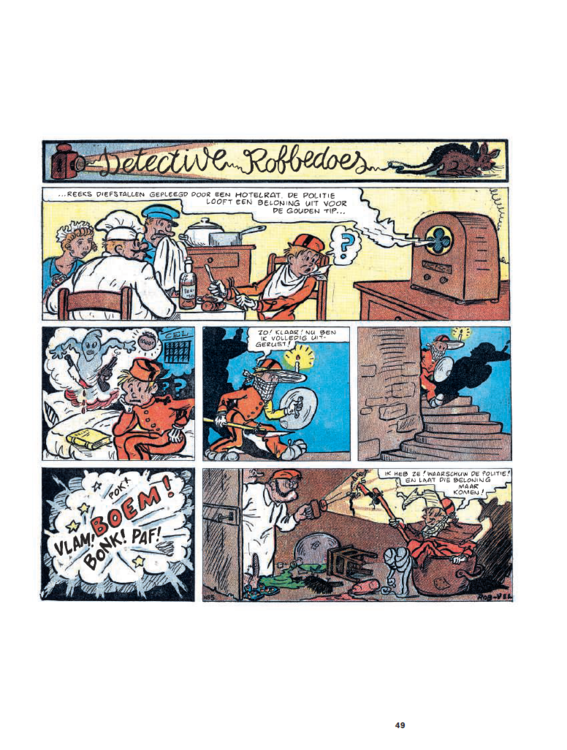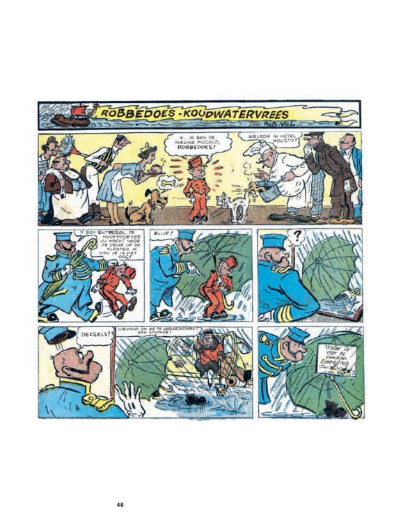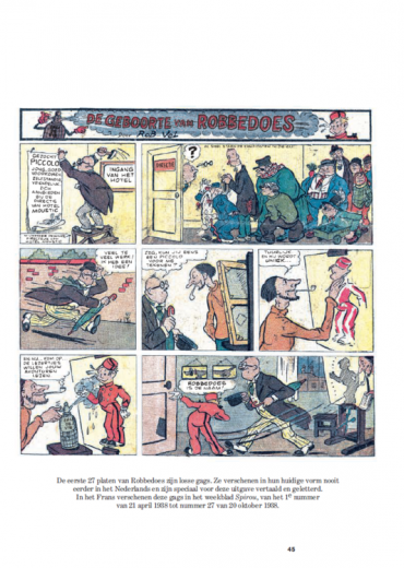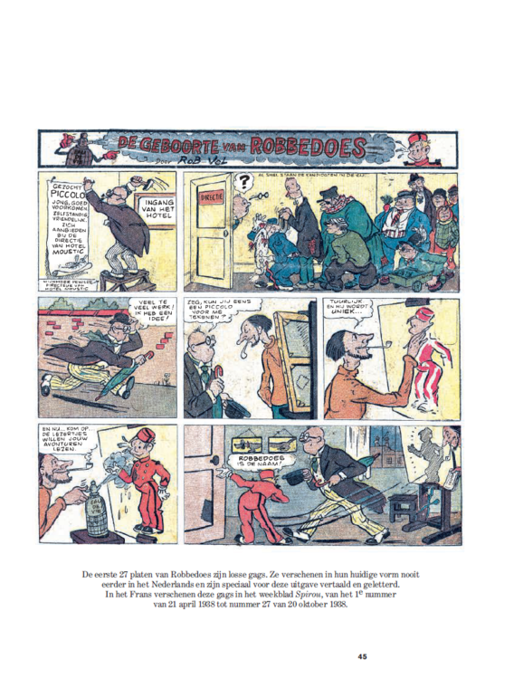 Jean Dupuis wist wat hij wilde: een weekblad dat een gezonde afleiding vormde voor de jeugd en niet vies was was van een beetje morele zedenlessen. Een naam had hij al: Spirou, wat zoveel betekent als 'roodharig' en 'guitig' in het dialect van Charleroi. In het Nederlands werd dat Robbedoes. Nu nog een tekenaar vinden die zijn personage een persoonlijkheid op papier kon aanmeten. Hij kwam terecht bij de Parijzenaar Robert Velter. Tussen 1938 en 1943 ondertekende die meer dan 200 platen van de avonturen van Robbedoes met zijn pseudo Rob-Vel. Die zijn nu voor het eerst allemaal gebundeld in deze prachtige integrale. Met 27 nooit eerder in het Nederlands verschenen platen en een uitgebreid historisch achtergronddossier. Beperkte oplage.
