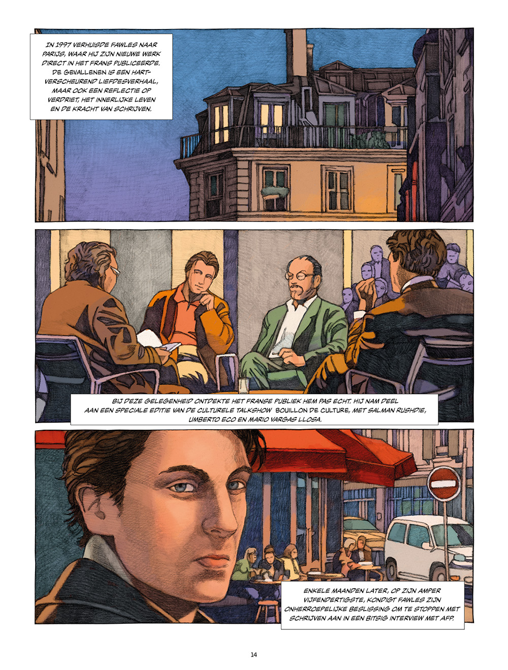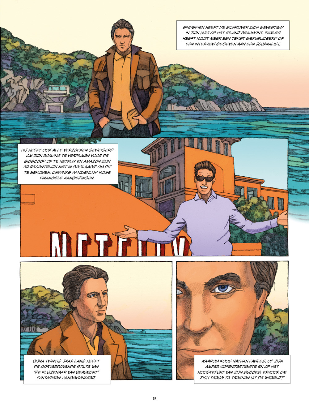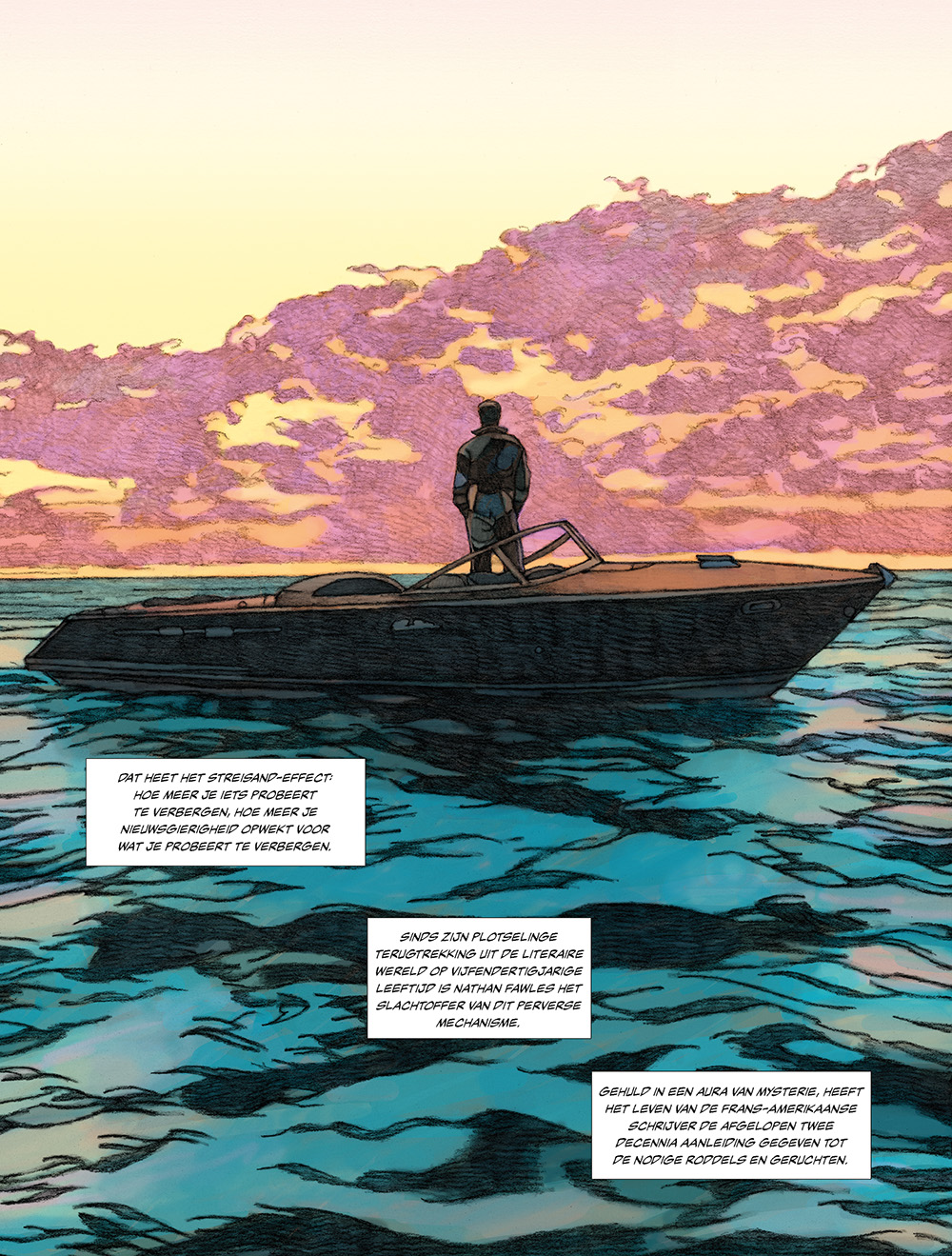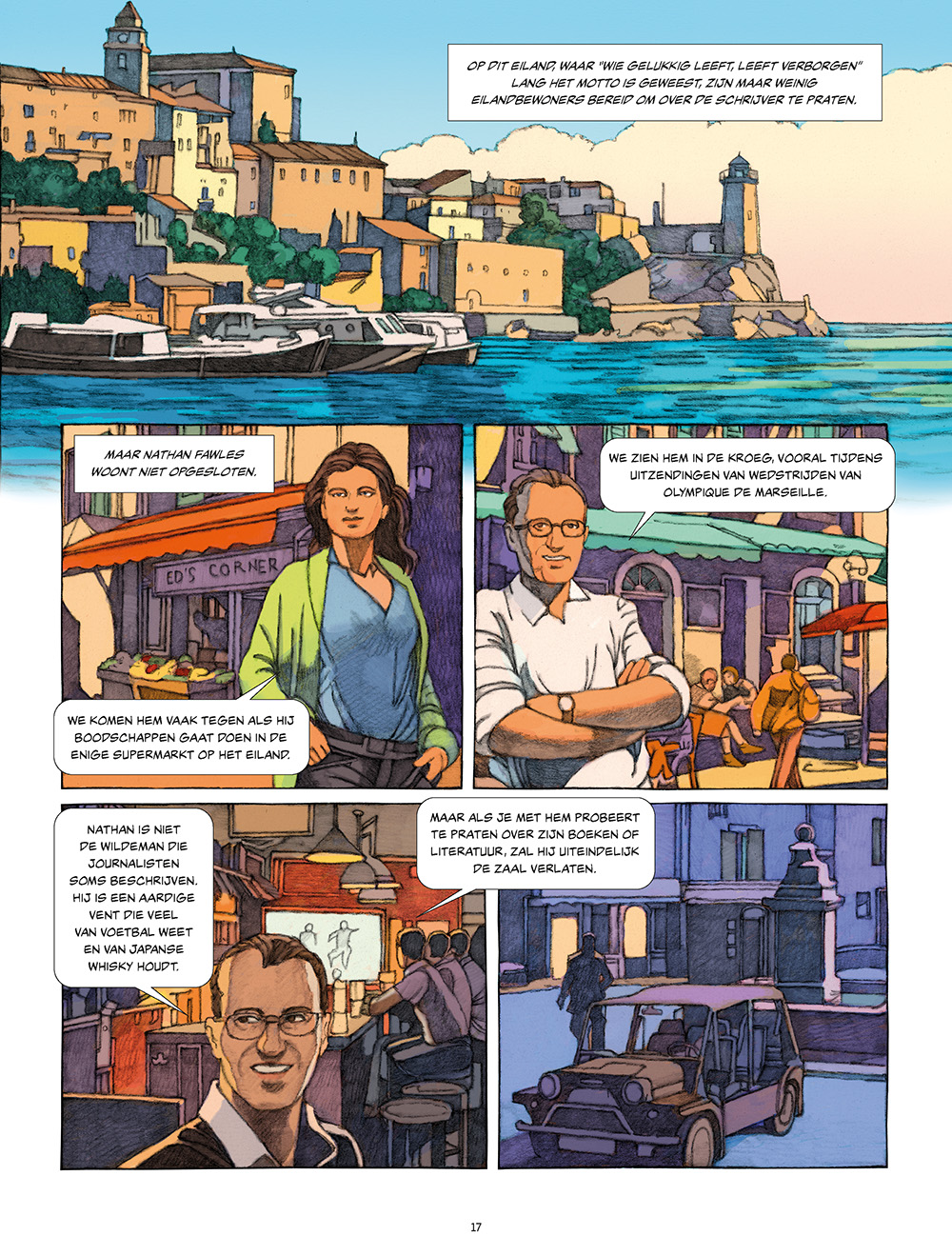 De koers van dit verhaal wordt stukje bij beetje verlegd van de jonge Raphaël die contact met Fawles wil maken in de richting van het duistere verleden van enkele eilandbewoners. Naarmate de jongeman meer weet te achterhalen, neemt ook de spanning toe, wat maakt dat je reikhalzend gaat uitkijken naar de ontknoping. Ik werd helemaal opgezogen in dit verhaal en werd verbluft door het einde. De tekeningen zijn realistisch, de gezichtsuitdrukkingen uitstekend. Van het bijzondere kleurenpalet en het ontbreken van geïnkte lijnen moet je houden, het geeft een apart effect. Een dijk van een thriller!
