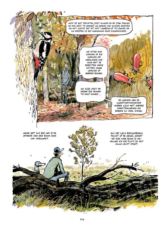 Scenarist Fred Bernard en tekenaar Benjamin Flao — Wanneer gaat iemand zijn Kililana Song vertalen? — mogen zich gelukkig prijzen. In tegenstelling tot soortgelijke verstripte boeken als Sapiens of De Wereld van Sofie hebben de auteurs hier grafisch boeiender materiaal voor handen. Een woud, bos of zelfs een verpieterde, mishandelde stadsboom levert nu eenmaal altijd mooie plaatjes op. Verhaaltechnisch worden de verschillende prima onderbouwde theorieën verlucht doordat we ook de carrière en privéleven van Peter Wohlleben en zijn familie volgen. Het zorgt ervoor dat je deze turf met plezier verder leest.