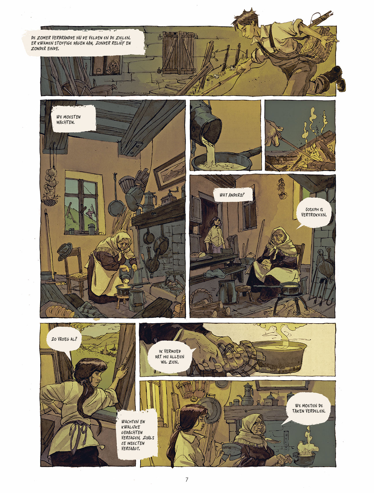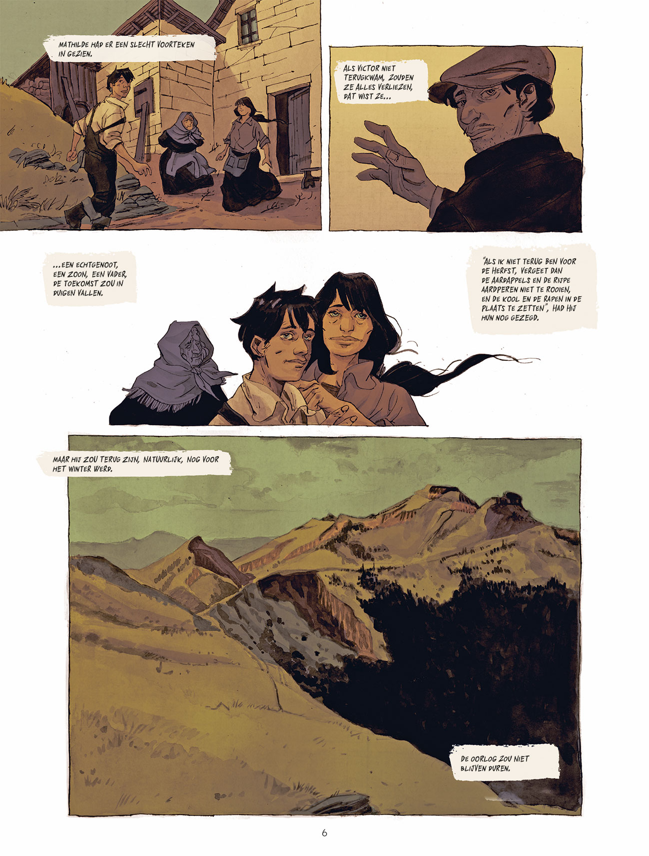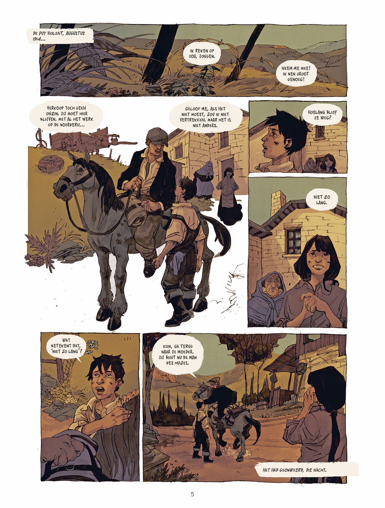 Diep in de Cantal, in die hete augustusmaand van 1914, maken de mannen zich op voor de oorlog. Joseph, vijftien jaar oud, moet de familieboerderij leiden, samen met zijn moeder, zijn grootmoeder en Léonard, de oude buurman die zijn vriend is geworden. In het aangrenzende domein zwelgt Valette, die door een verminkte hand niet in aanmerking komt voor legerdienst, in zijn verbittering en woede. Hij moet onderdak bieden aan zijn schoonzus, Hélène, en haar dochter Anna. De komst van die twee vrouwen gooit de onveranderlijke orde van het leven in de bergen grondig overhoop. Een tragisch, aangrijpend verhaal over een boerenfamilie tijdens de Eerste Wereldoorlog
