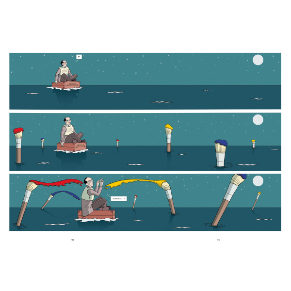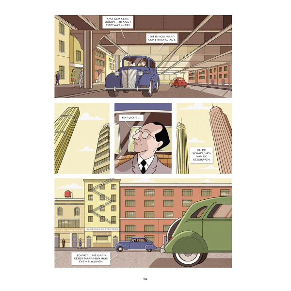 Je kan de tekenstijl van Erik de Graaf (Scherven, Littekens, Het onvoorstelbare verbeeld) houterig of stijf noemen, ook wel strak en helder, maar wat past hij subliem bij de kunst van Mondriaan (1872-1944). Deze graphic novel is zelf een kunstwerk en dan heb ik het niet alleen over de prachtige uitklapplaten. De stijl past perfect bij de discipline van Mondriaan.