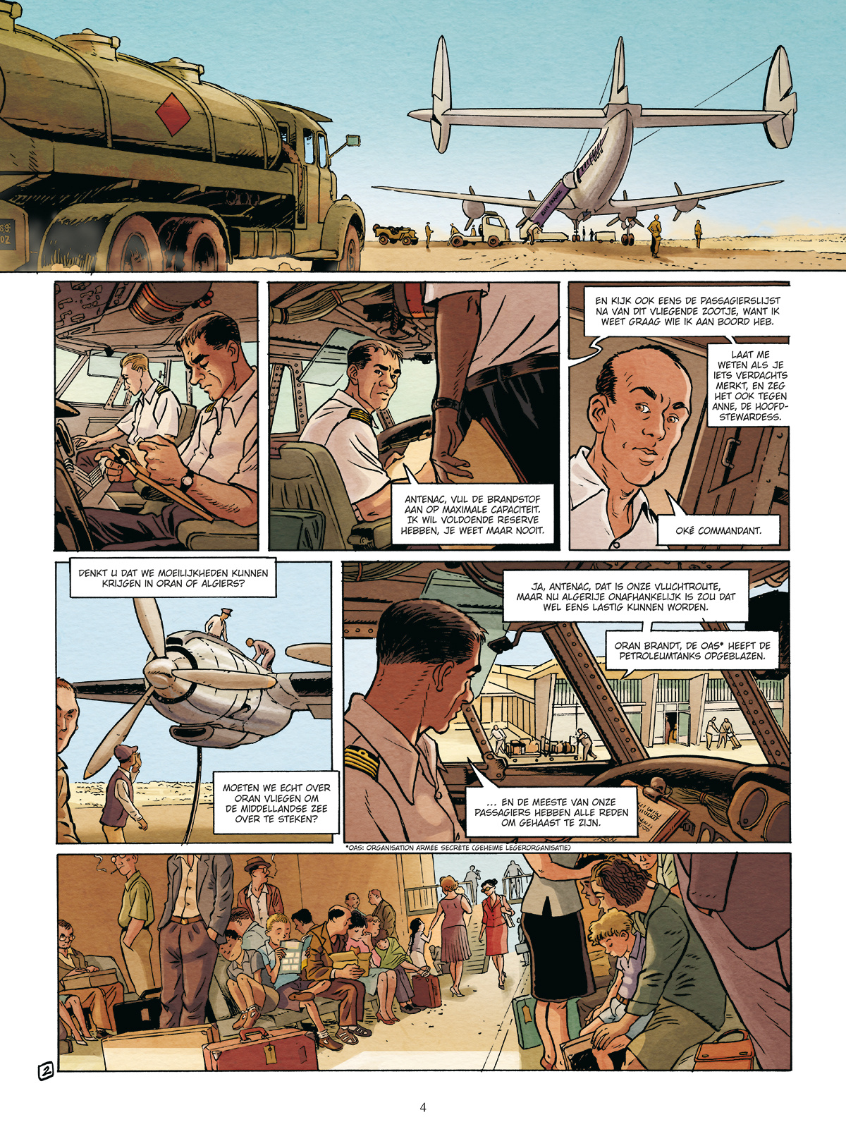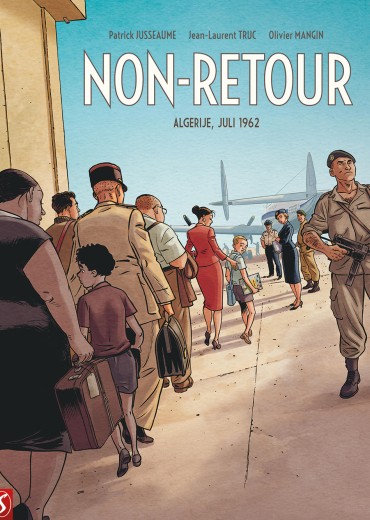 Score moyen 5 / 5Een vlucht enkele reis Het is 2 juli 1962 en een laatste vlucht zal vertrekken van het vliegveld Colomb-Béchar in Algerije richting Marseille. De oorlog is beëindigd en Algerije zal eerstdaags officieel onafhankelijk verklaard worden en geen kolonie meer zijn van Frankrijk. Het vliegtuig, een Constellation, zal vol zitten met passagiers van divers pluimage die niet meer veilig in Algerije kunnen blijven: een vrouw met vier kinderen — de oudste zoon is dol op strips (Robbedoes) en vooral Buck Danny —, een arts met zijn echtgenote, een weduwe die een bordeel had en anderen. Ze zoeken contact met elkaar tijdens het wachten op vertrek. De opvallendste passagiers zijn kolonel Lomberti van het Franse leger, commissaris Daubrac van de staatsveiligheid DST en verder een mogelijke spion van de Sovjets. De crew neemt zich voor om de vlucht veilig te laten landen in Frankrijk. Ook al wordt Algerije onafhankelijk, het is nog zeer onrustig in het land. De terreurorganisatie OAS (Organisation de l’Armée Secrète) doet met aanslagen nog al het mogelijke om de onafhankelijkheid te voorkomen. Wanneer de Constellation bijna boven de stad Oran vliegt, krijgt het bevel van de militaire verkeersleiding om te landen voor prioritaire evacuaties. Delen van de stad en oliedepots staan in brand door acties van de OAS. Aangezien het toestel volzet is en ook de kerosinevoorraad beperkt, wil de boordcommandant eerst niet landen. Kolonel Lomberti trekt zijn pistool om de commandant alsnog tot landen te dwingen. Er ontstaat tumult en het is twijfelachtig of het vliegtuig alsnog zal kunnen doorvliegen naar Frankrijk... Het album op scenario van Jean-Luc Truc is gebaseerd op diens jeugdherinneringen toen zijn moeder met alle kinderen effectief wegvluchtte uit Algerije in juli 1962. Oorspronkelijk zou zijn vriend Patrick Jusseaume het verhaal in beeld brengen, maar na een tiental pagina's met schetsen overleed hij op 25 oktober 2017. Olivier Mangin (Liefde in Oorlogstijd) heeft het tekenwerk overgenomen en verdergezet. Het is interessant om de schetsen van Jusseaume, achterin het album, te kunnen vergelijken met de pagina’s van Mangin. Er is een duidelijke gelijkenis qua vormgeving en aflijning, maar de tekeningen en personages van Jusseaume zijn toch ietwat levendiger en karaktervoller, zoals ze ook te zien zijn in de reeks Tramp die hij tekende. In dit album maken we even kennis met een klein fragment van de geschiedenis die toch gedurende jaren Frankrijk, onder president Charles de Gaulle, heeft beroerd, namelijk de onafhankelijkheidsstrijd van de kolonie Algerije en allerlei aanslagen door de OAS, onder meer op de Gaulle. Wij verwachtten een beetje meer achtergrondinformatie te vernemen over hoe dit alles is kunnen gebeuren. Het zijn hier vooral de levens van enkele individuen die in flashbacks kort belicht worden. Hun overhoop gehaalde levens en de ultieme vliegreis hebben ons wel aangezet om wat te gaan opzoeken over de onafhankelijkheid van Algerije. JAN GOFFIN ssa