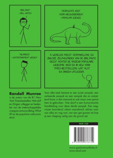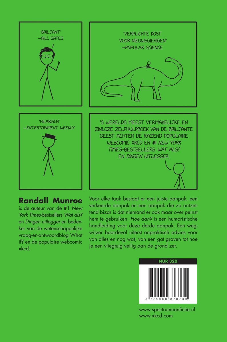De hilarische opvolger van Wat als? Van de auteur van Wat als? en het brein achter xkcd.com – al meer dan 90.000 exemplaren verkocht 'Briljant.' Bill Gates Voor elke taak bestaat er een juiste aanpak, een verkeerde aanpak en een aanpak die zo ontzettend bizar is dat niemand er ook maar over peinst hem te gebruiken. Hoe dan? is een humoristische handleiding van bestsellerauteur Randall Munroe voor deze derde aanpak. Een wegwijzer boordevol uiterst onpraktisch advies voor van alles en nog wat, van een gat graven tot hoe je een vliegtuig veilig aan de grond zet. Net als in zijn eerdere boek Wat als? moedigt Randall Munroe ons op briljante wijze aan om de meest absurde uitersten van het mogelijke op te zoeken. In combinatie met zijn scherpe strips en amusante illustraties is Hoe dan? een heerlijke, verbazingwekkende en hilarische manier om de wetenschap en technologie die achter het dagelijkse leven schuilgaan beter te begrijpen. Een perfect cadeauboek voor iedereen die meer te weten wil komen over 'Door de absurditeit en de vrolijke tekeningen voelt het boek vederlicht, maar toch leer je veel. Over raketten, over vlinders, over geschiedenis. En je leert vooral om met de onverzadigbaar nieuwsgierige blik van Munroe naar de wereld te kijken.' De Correspondent 'Continu fascinerend en vermakelijk.' The Wall Street Journal