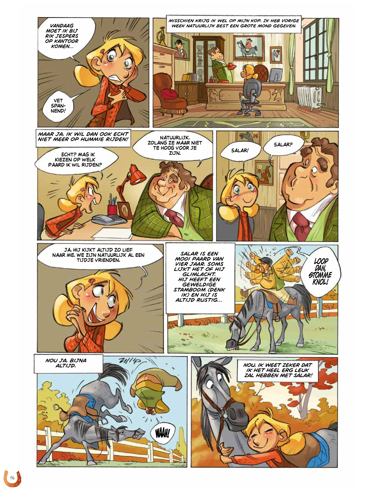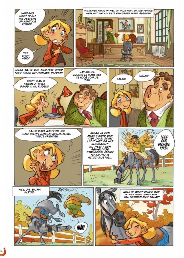 Mijn naam Celestine. Ik ben 10 jaar en ... mijn passie is paarden zoals je al wel verwacht had. Maar geloof me, dat is niet altijd het geval geweest. Toen ik vroeger klein was en ik langs manege 'De vier hoefijzers' liep vond ik ze niet eens mooi. Ze kregen het zelfs voor elkaar om me in mijn neus te bijten! Tot ik op een dag Salar leerde kennen. Hij werd mijn beste vriend en ik de zijne. Nu galoppeer ik niet meer op hem, maar ik vlieg gewoon ...