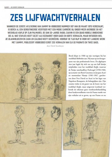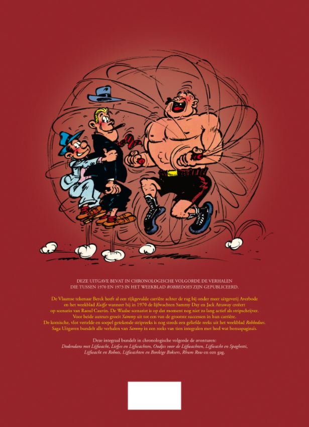 herdruk De volledige reeks Sammy wordt heruitgebracht in integrale door Saga uitgaven. Er verschijnen 10 delen binnen de drie jaar. er bestaat ook een luxe van De Vlaamse tekenaar Berck heeft al een rijkgevulde carrière achter de rug bij onder meer uitgeverij Averbode en het weekblad Kuifje wanneer hij in 1970 de lijfwachten Sammy Day en Jack Attaway creëert op scenario van Raoul Cauvin. De Waalse scenarist is op dat moment nog niet zo lang actief als stripschrijver. Voor beide auteurs groeit Sammy uit tot een van de grootste successen in hun carrière. De komische, vlot vertelde en soepel getekende stripreeks is nog steeds een geliefde reeks uit het weekblad Robbedoes. Saga Uitgaven bundelt alle verhalen van Sammy in een reeks van tien integralen met heel wat bonuspagina’s. Deze integraal bundelt in chronologische volgorde de avonturen: Dodendans met Lijfwacht, Liefjes en Lijfwachten, Oudjes voor de Lijfwachten, Lijfwacht en Spaghetti, Lijfwacht en Robots, Lijfwachten en Bonkige Boksers, Rhum Row en twee gags. Saga Uitgaven geeft Sammy integraal uit. Deel 1 van de reeks over de lijfwachten Sammy Day en Jack Attaway, een komisch stripduo dat Cauvin twee jaar na zijn doorbraakreeks De Blauwbloezen creëerde voor Berck en daarna Jean-Pol, staat in januari gepland. 264 pagina's dik, 34,95 euro, hardcovereditie. De reeks zal ook in luxe-edities verschijnen met linnen rug, telkens een ex libris met een reproductie van een zeldzame illustratie en een speciaal hiervoor gemaakte diepdrukstempel. Het is helaas uitgesloten om Berck de ex librissen te laten signeren. De afbeeldingen die je hier ziet, zijn die van de cover, de backcover en de ex libris (een niet gebruikt ontwerp voor een poster voor Spirou uit 1970) van deel 1. Sinds vorige week hebben stripspeciaalzaken het aanbod om te bestellen gekregen voor de luxes, die 65 euro zullen kosten. Contacteer je winkelier als je geen exemplaar wil missen. En dat geldt misschien ook voor de gewone hardcoverintegralen zodat Saga Uitgaven de oplage tijdig kan verhogen als de vraag groot genoeg is. De complete reeks zal in tien delen verschijnen. En het wordt een vastberaden tempo met in 2021 de delen 1 tot 4, in 2022 de delen 5 tot 8 en in 2023 tot slot de laatste twee integralen. Alle verhalen worden chronologisch gebundeld en worden opnieuw geletterd, de oorspronkelijke lettering werd namelijk niet gedigitaliseerd en is verloren gegaan. De reguliere albumreeks sloeg in het begin oudere verhalen over die dan later werden gepubliceerd en er werden andere verhalen omgewisseld. Deel 1 bevat alvast de verhalen Dodendans met Lijfwacht, Liefjes en Lijfwachten, Oudjes voor de Lijfwachten, Lijfwacht en Spaghetti, Lijfwacht en Robots, Lijfwachten en Bonkige Boksers, het eerste lange avontuur Rhum Row en een gag. Elke bundel bevat vier reguliere albums die Dupuis uitgaf, aangevuld met soms niet eerder in album verschenen gags en korte verhalen. De oorspronkelijke covers, backcovers van de eerste drukken en titelpagina's van alle albums worden paginagroot opgenomen, zoals kopers van integralen het liefst hebben. Er gaat dus niets verloren, maar je krijgt zeker méér. De achtergronddossiers zullen telkens een zestigtal pagina's dik zijn met zeldzaam materiaal, reproducties van originelen, onbekende extra's, promomateriaal, reclame-uitstapjes, ontwerpen, dikwijls rechtstreeks uit de archieven van Berck. De teksten bieden uitgebreide carrièreoverzichten van zowel Berck als Cauvin met extra artikelen over specifieke onderwerpen. Van Berck zullen ook zijn Averbode-, Kuifje- en andere periodes ruimschoots voorgesteld worden. En aan de hand van de voorpublicatie in het weekblad Robbedoes en Spirou, die van 1970 tot 2009 liep, krijg je een toffe terugblik op de inhoud en evolutie van het roemrijke weekblad. Voor het beeldmateriaal en de inhoud wordt een beroep gedaan op drie notoire Berck-verzamelaars. Twee ervan werden gerekruteerd uit de Facebookgroep Stripknip. In de zevende integraal wordt Bercks beste en meest volledige interview herplaatst, met toestemming van Kurt Morissens die de tekenaar ooit interviewde voor Brabant Strip Magazine. In diezelfde integraal staat ook Jean-Pols eerste verhaal wiens carrière en bijdrage aan Sammy voornamelijk in de integralen 9 en 10 worden behandeld. Voor Jean-Pol is het een droom die uitkomt omdat een oudere Franse integrale reeks van Sammy uit de jaren 1990 zijn verhalen niet bundelde. Die oude reeks, met een povere omkadering, zal in niets te vergelijken zijn met de aanpak van de nieuwe integrale reeks, die heel wat huidige integrale reeksen van Dupuis als voorbeeld neemt qua volledigheid, presentatie en inhoud. Wat Dupuis voor Sammy tot nu toe niet van plan was in het Frans, doet Saga Uitgaven dan maar zelf in het Nederlands. Dat plan koesterde de uitgeverij al drie-vier jaar voordat ze eindelijk de toestemming kregen om de reeks te mogen uitgeven.